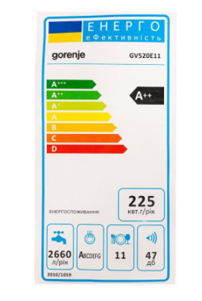 Пристрій обладнано однофазним асинхронним мотором з рівнем шуму до 47 дБ. У камері з нержавіючої сталі встановлено 3 розбризкувачі, струмені яких розподіляються на п'яти рівнях, рясно зрошуючи кожен із них. Керується посудомийна машина Gorenje GV520E11 зручними електронними кнопками.