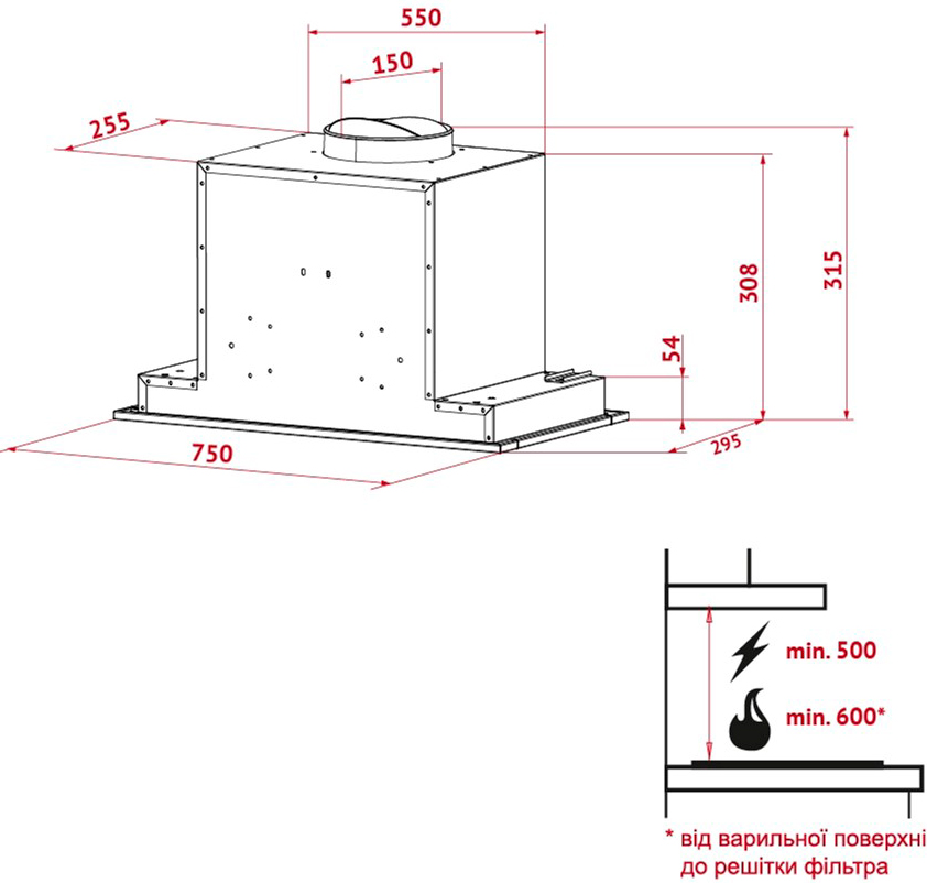 Повновбудована витяжка вирізняється не лише дизайном, а й конфігурацією. Вона включає:
