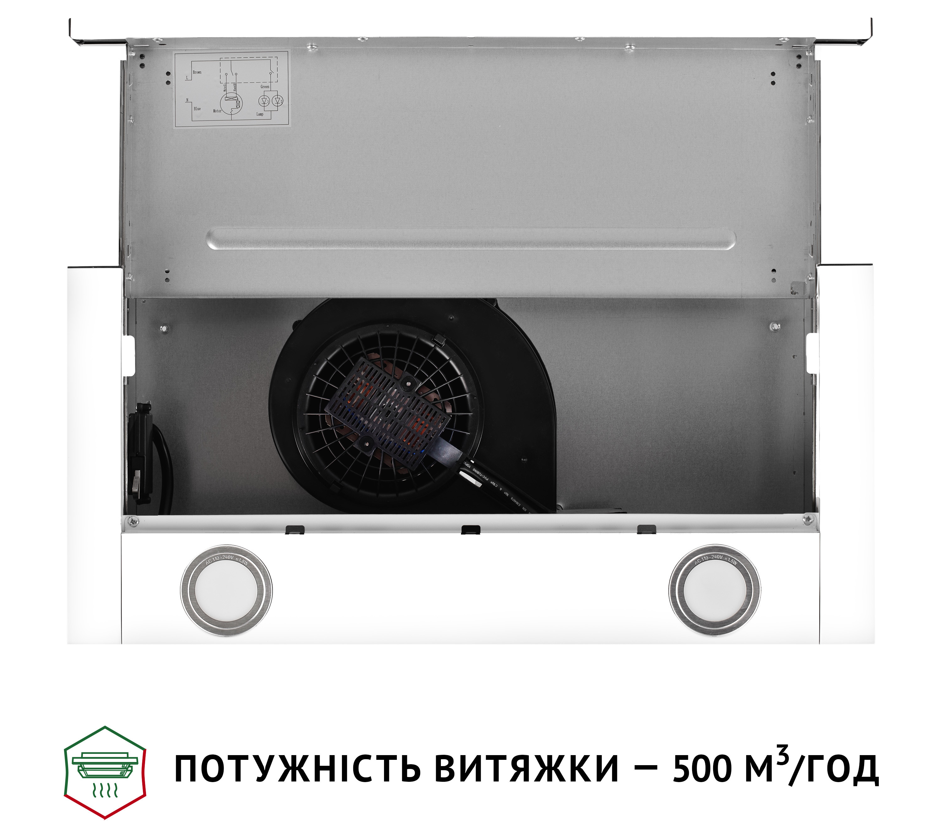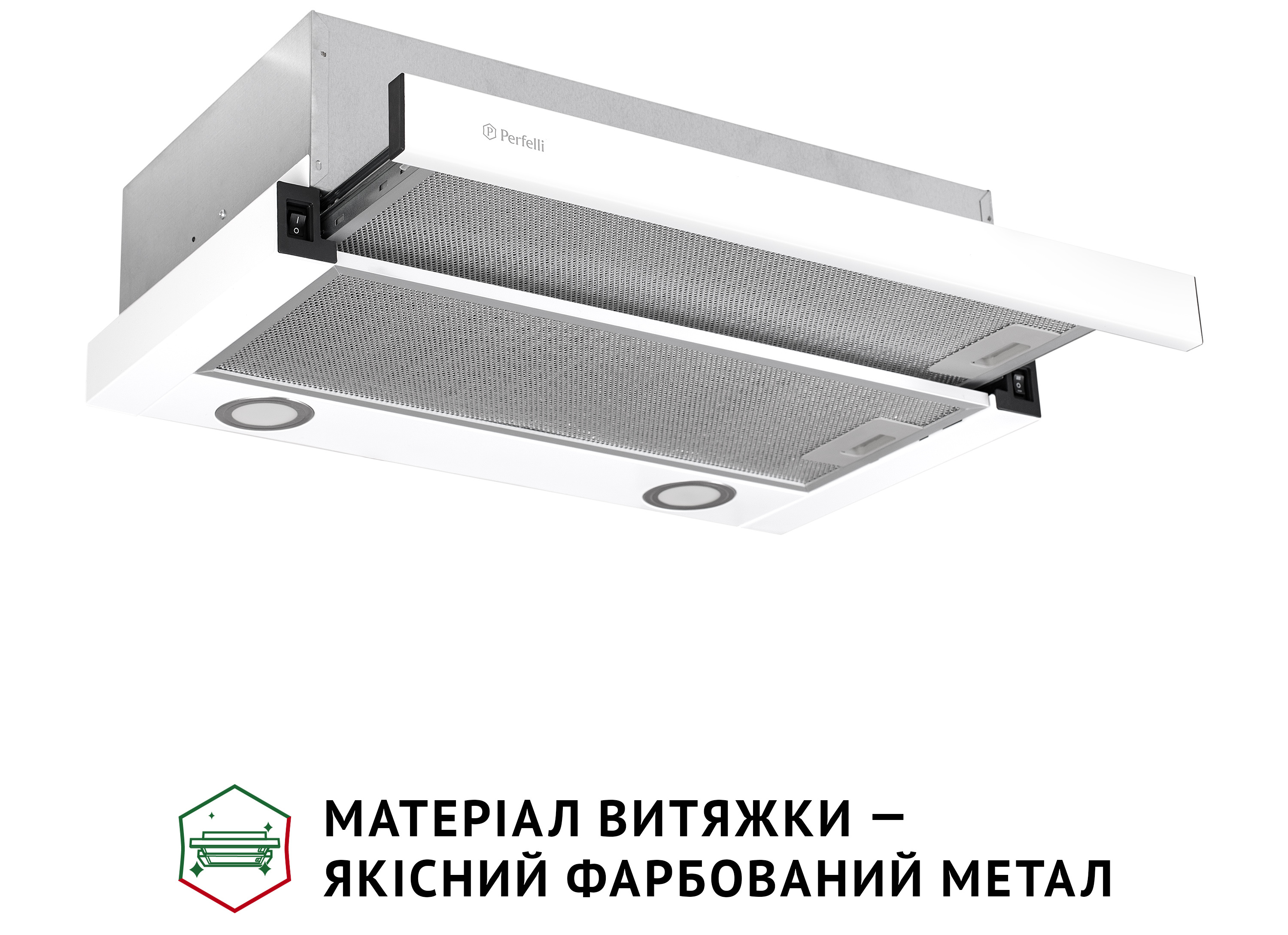 Витяжка працює на двох швидкостях, що дозволяє обрати оптимальний режим очищення повітря залежно від ситуації: