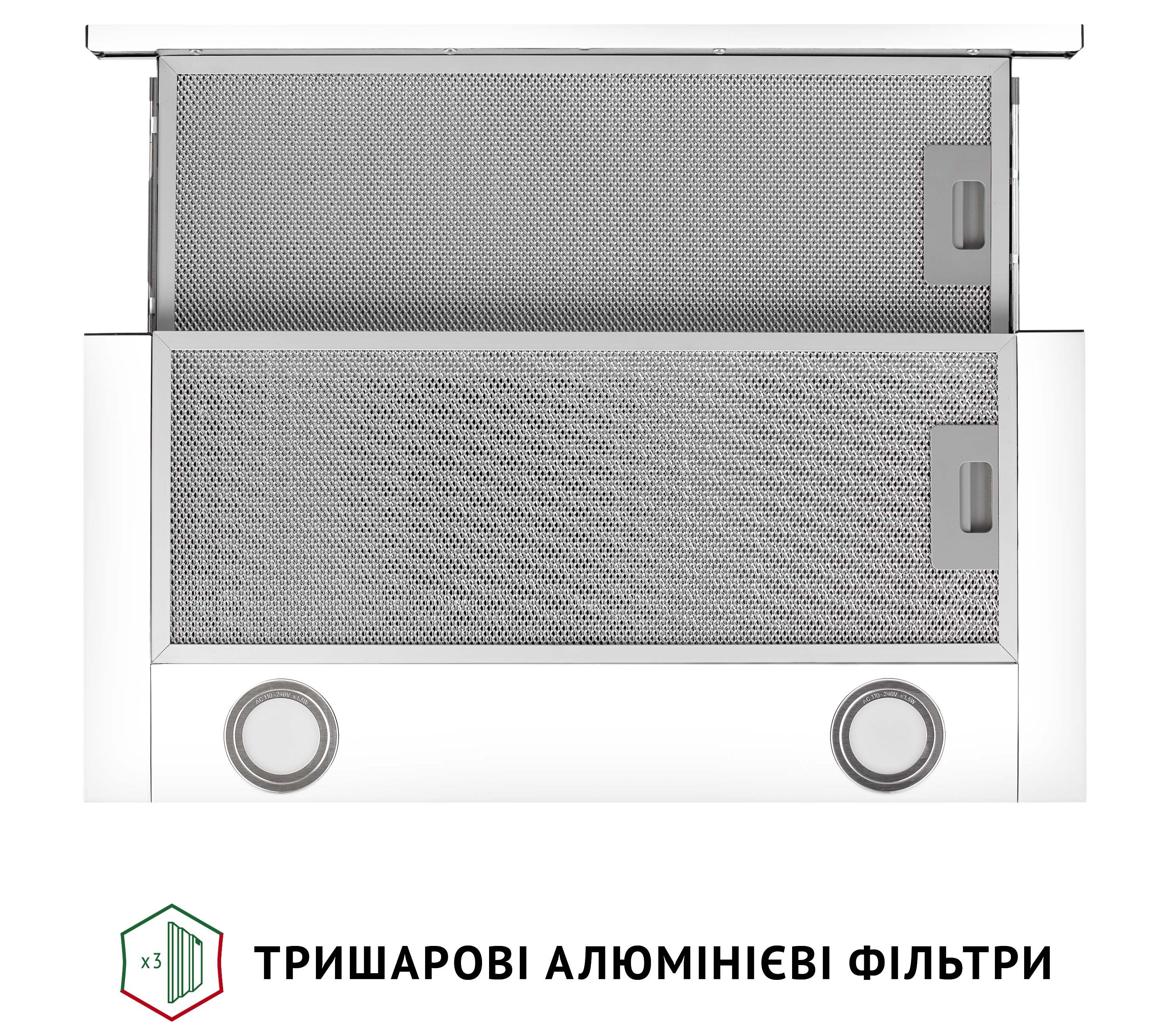 Витяжка оснащена двома тришаровими алюмінієвими фільтрами, які ефективно захищають мотор та інші елементи пристрою від жиру і забруднень. Фільтри легко миються у теплому мильному розчині або у посудомийній машині.