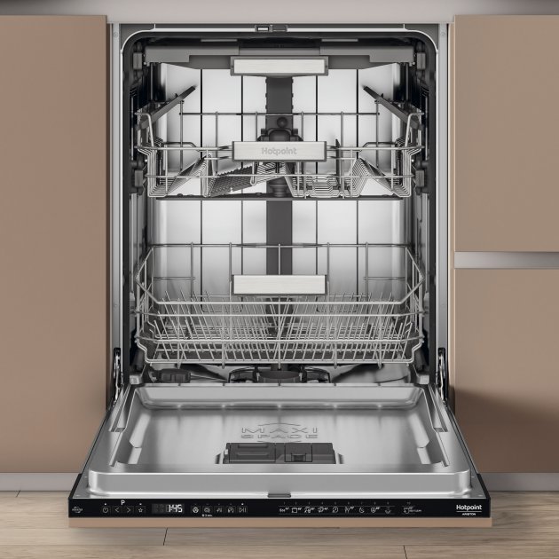 Вбудована посудомийна машина HOTPOINT ARISTON HM7 42 L: Повнорозмірна повністю вбудована посудомийна машина HOTPOINT ARISTON HM7 42 L може вмістити до 14 комплектів посуду та має високий клас енергоспоживання A++. Вона пропонує 7 програм миття, включаючи делікатну програму для крихкого посуду та інтенсивну для сильно забрудненого. Система сушіння Dynamic Dry забезпечує ефективне видалення вологи з посуду. Функція відкладеного старту дозволяє запрограмувати початок миття на зручний час. Економічність та різноманітність програм роблять цю модель привабливим варіантом для сучасних кухонь.