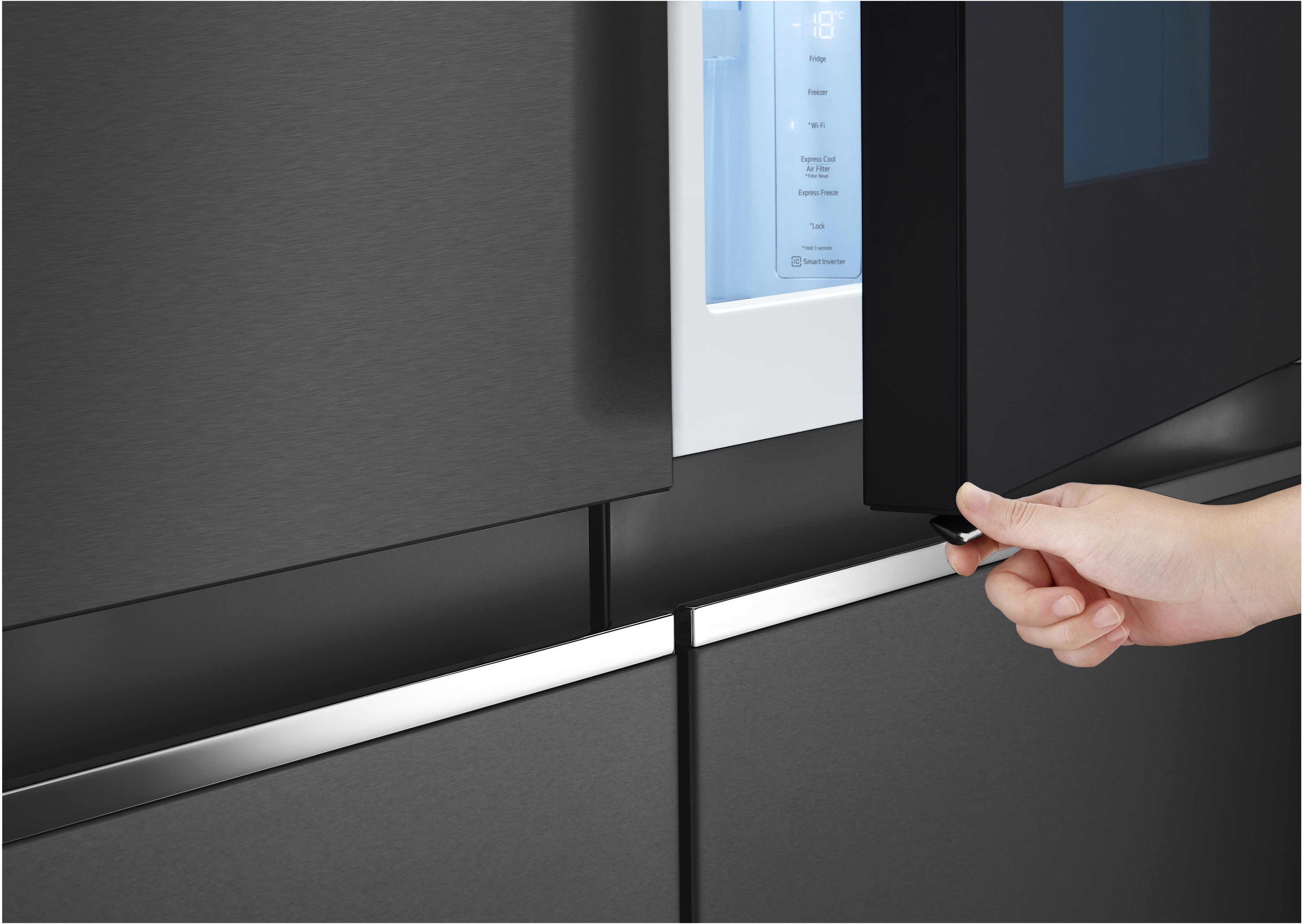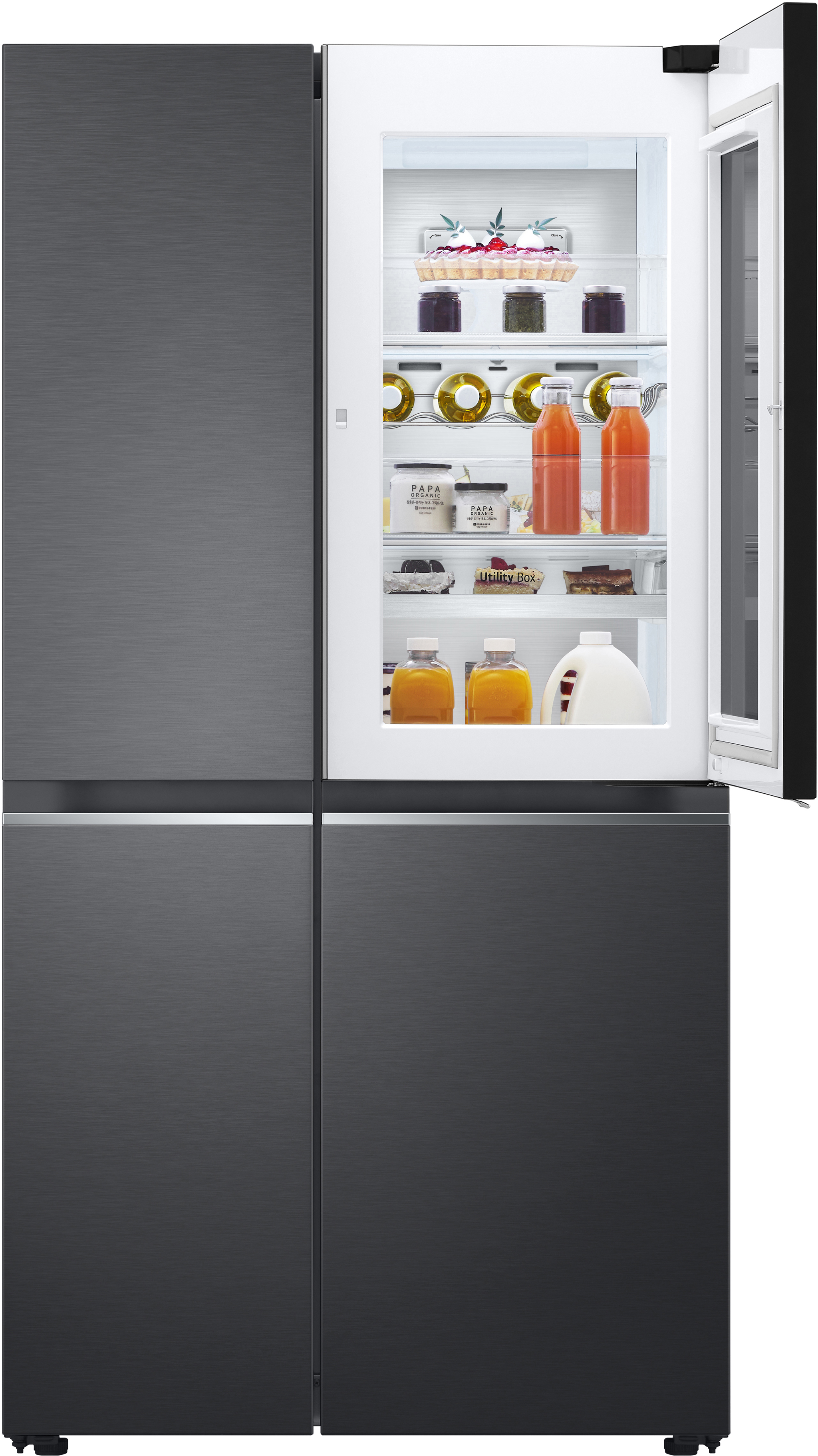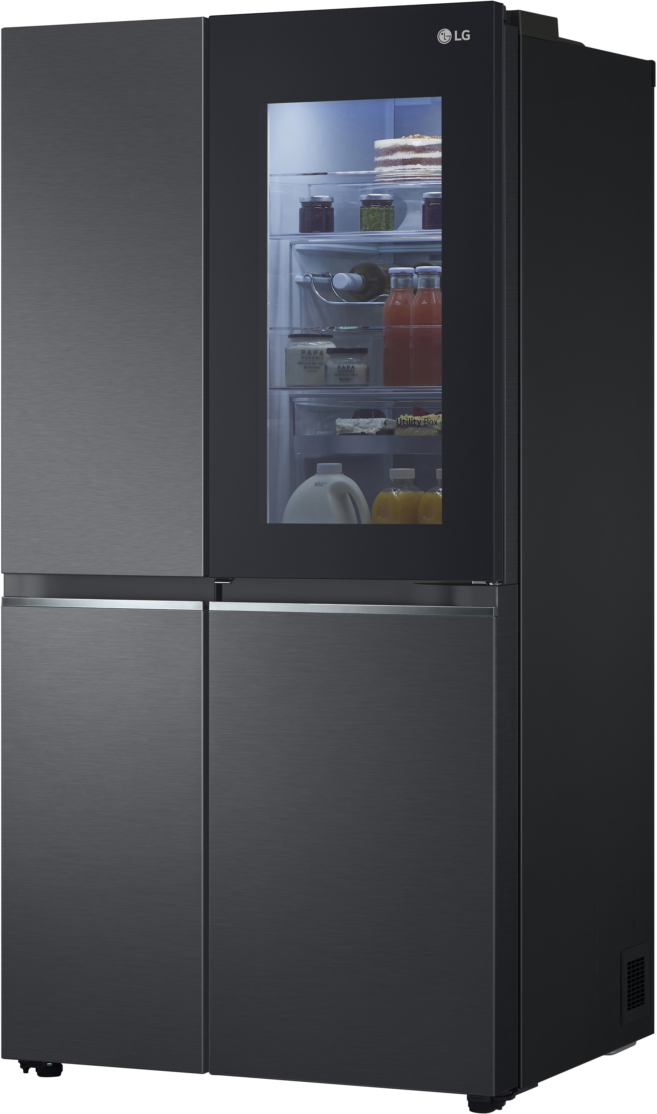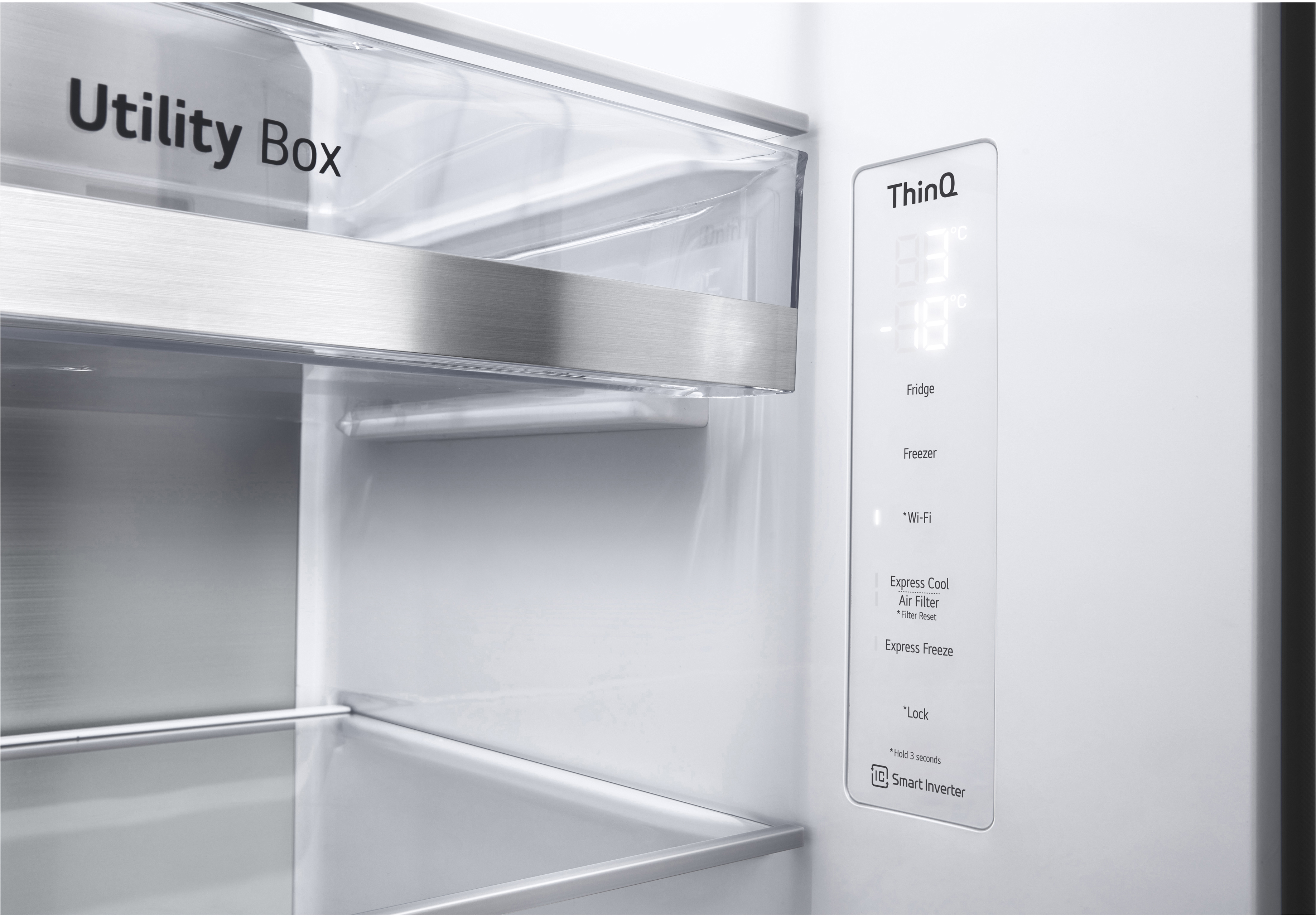 Для винних поціновувачів передбачена зручна полиця для зберігання 4 пляшок, а відсік Utility Box ідеально підходить для дрібних продуктів. Система очищення повітря Hygiene Fresh+ усуває до 99,9% бактерій, продовжуючи термін зберігання продуктів. Модель оснащена Wi-Fi для підключення до ThinQ™, що дозволяє контролювати холодильник зі смартфона або планшета, включаючи зміну температури та діагностику можливих несправностей.