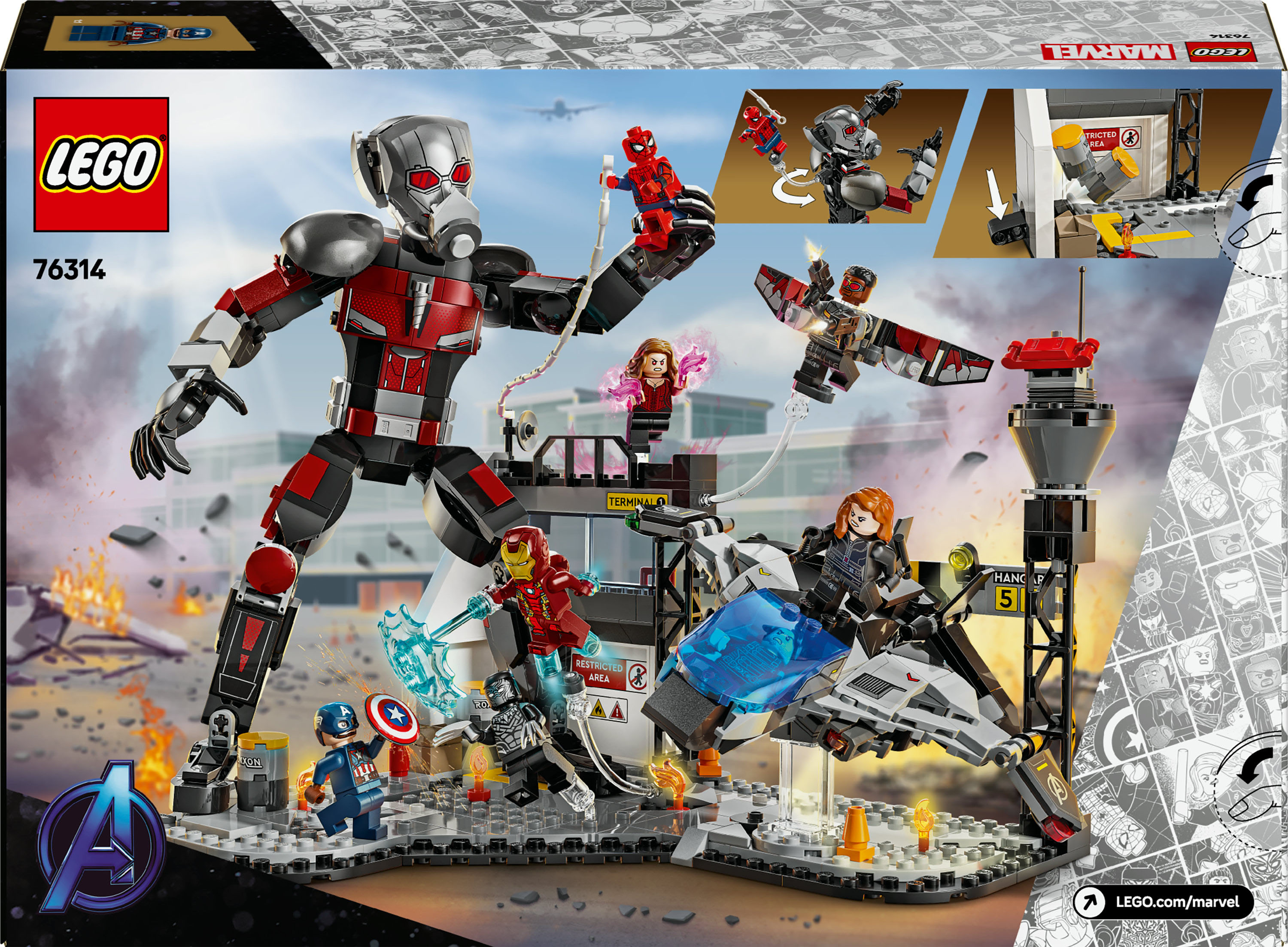 Цей ігровий конструктор побудований навколо сцени битви в аеропорту у фільмі Marvel Studios Перший месник: Протистояння. У набір входять 8 мініфігурок — Капітана Америка, Зимового солдата, Ванди, Сокола, Залізної людини, Людини-Павука, Чорної вдови і Чорної Пантери — зі зброєю та аксесуарами, а також повністю рухома фігурка Людини-мурахи, що сягає 24 см заввишки. Літак Квінджет має складні крила й кабіну, що відкривається, в якій розміщується мініфігурка пілот. Бойовим діям також сприяє функція вибухової бочки, вбудована в деталях аеропорту. Діти можуть масштабувати й повертати моделі під час конструювання за допомогою цифрового додатка LEGO Builder.