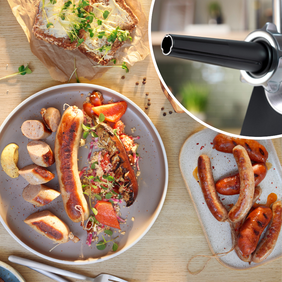 - Насадка для приготування домашніх ковбасок: дозволяє готувати власні смачні курячі, яловичі, свинні або вегетаріанські ковбаски. Просто додаючи різні спеції та трави, можна придумати нові смаки для барбекю. Можна мити в посудомийній машині.