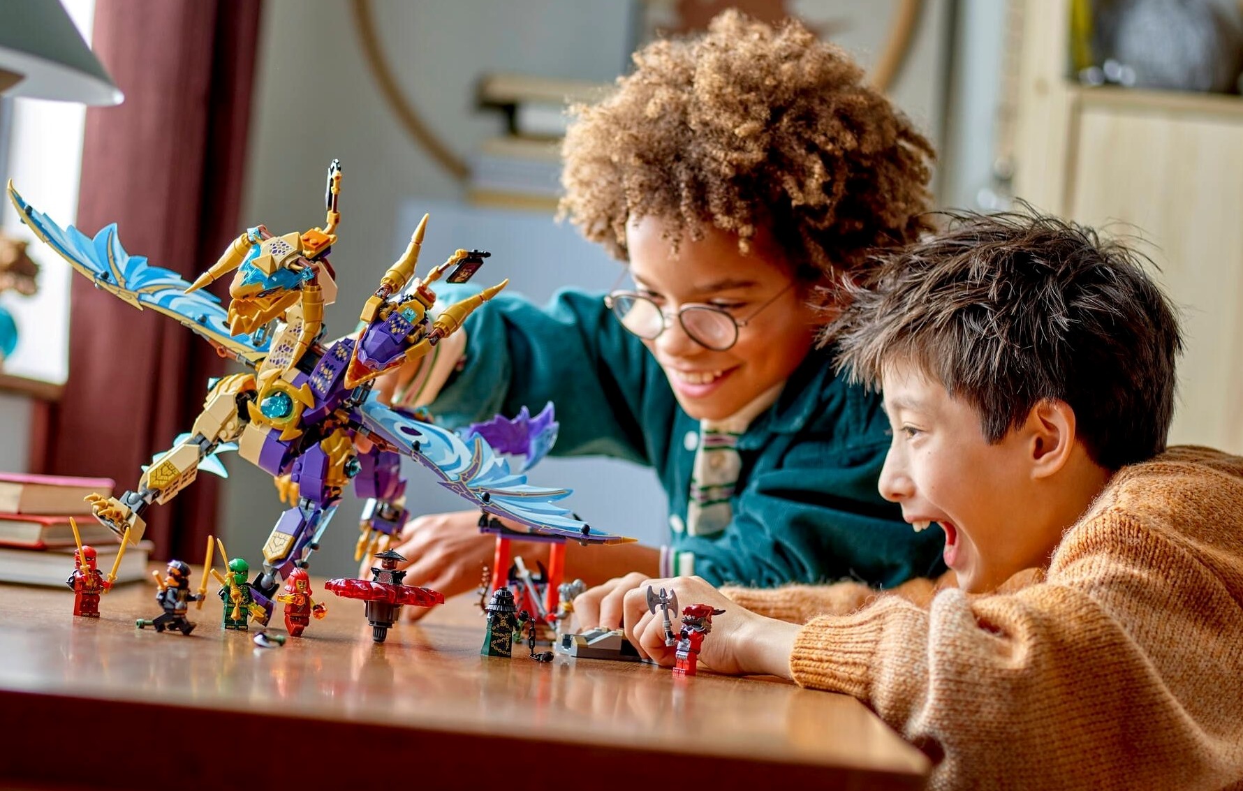 - Інтерактивний дракон NINJAGO – діти можуть активувати стрілянину по тулубу дракона та рухати його великими крильцями, використовуючи важіль на спині