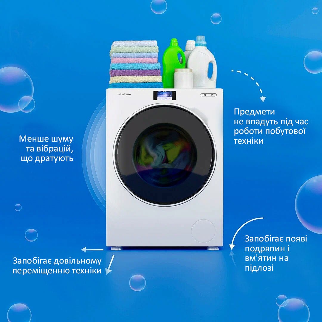 - Захищають підлогу від подряпин і запобігають падінню речей із поверхні пральної чи сушильної машини.