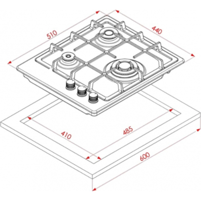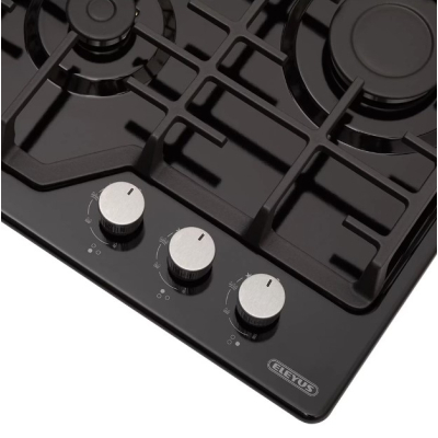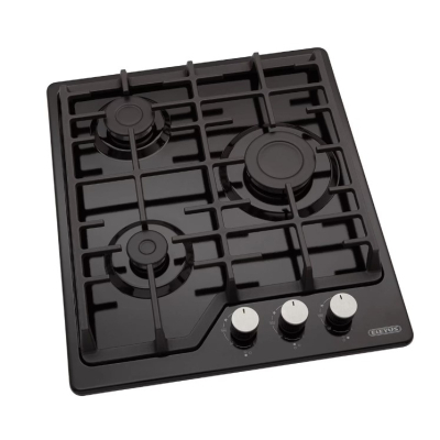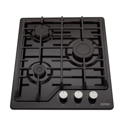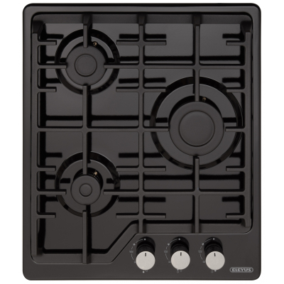 Тип поверхні - газова, нержавіюча сталь, кількість конфорок - 3, Задня ліва 1.7 кВт, Передня ліва 55 мм/ 1 кВт, права: потужністю 3 кВт, Управління - механічне, Газ-контроль - є, Електропідпал - так, Матеріал решіток - чавун, бутан/зріджений, 220 В, Розміри ніші для вбудовування - 5 х 41 х 48 см, 7.5 кг, чорний