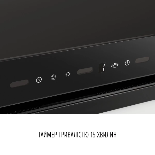 Витяжка оснащена таймером, який дозволяє автоматично відключити її через 15 хвилин, запобігаючи її тривалій роботі без необхідності.