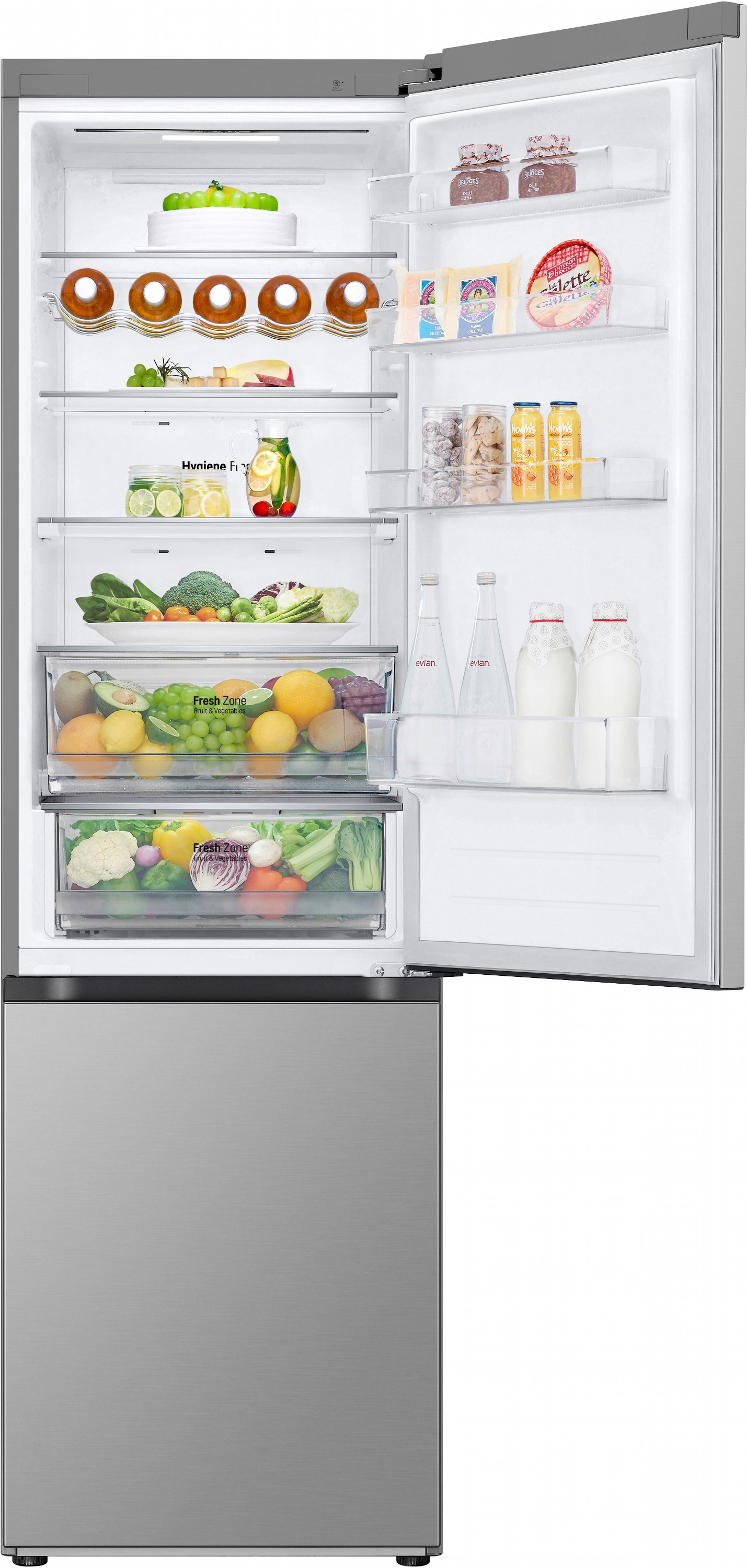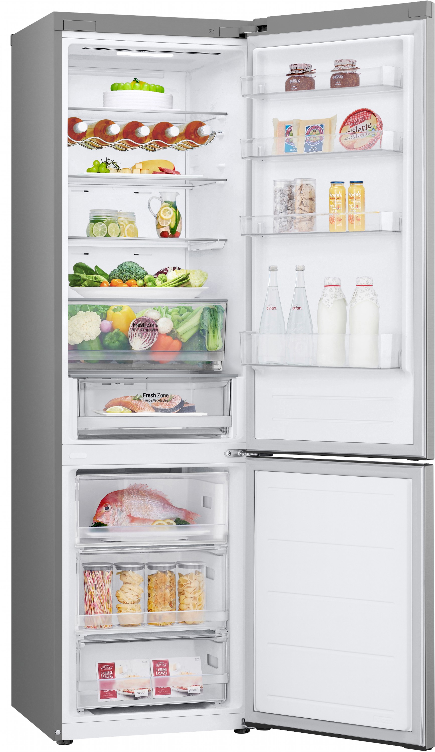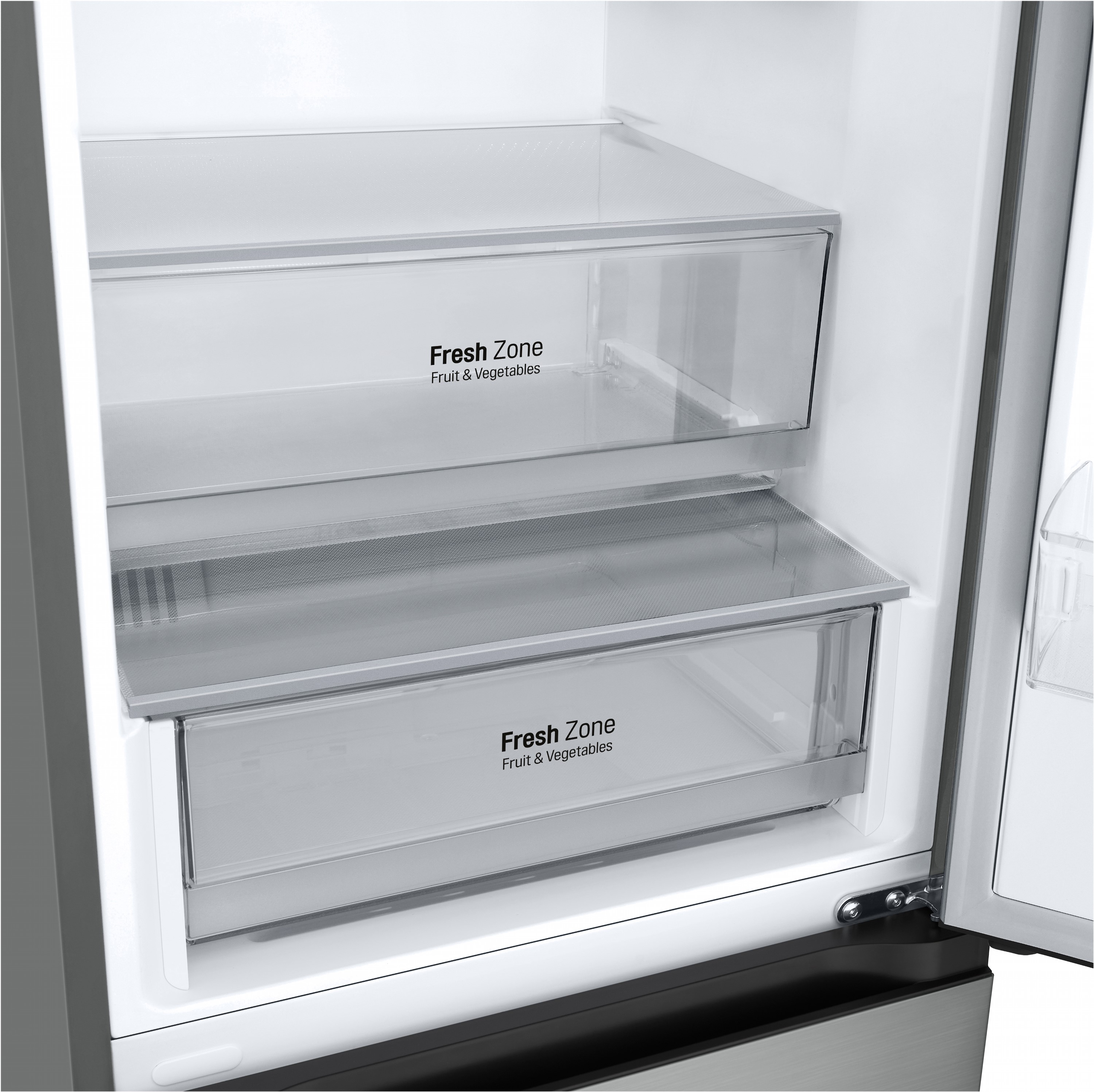 Total No Frost усуває потребу в розморожуванні й запобігає утворенню льоду, зберігаючи продукти свіжими довше. Зона свіжості Fresh Zone створена спеціально для м’яса, риби або овочів, утримуючи стабільно низьку температуру.