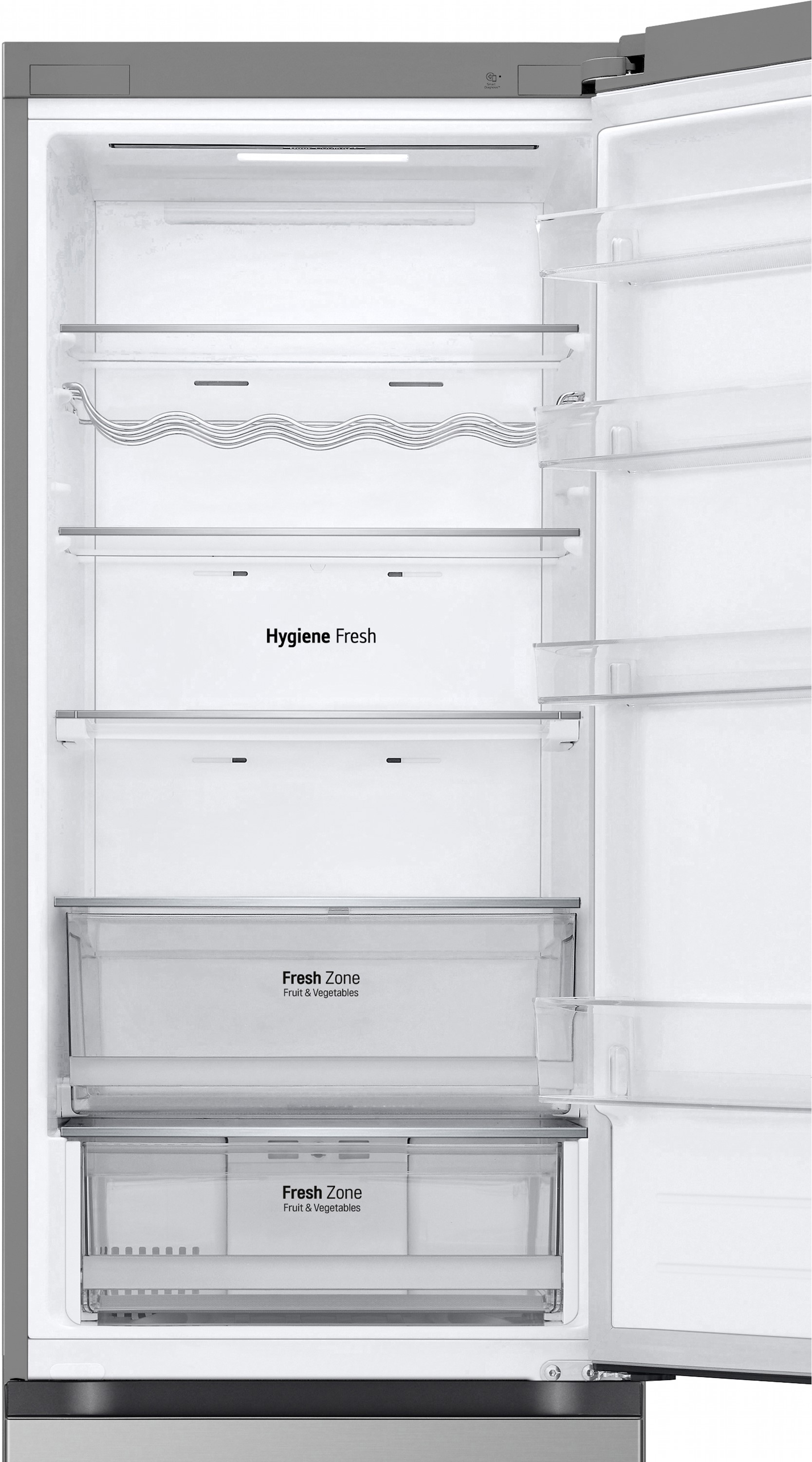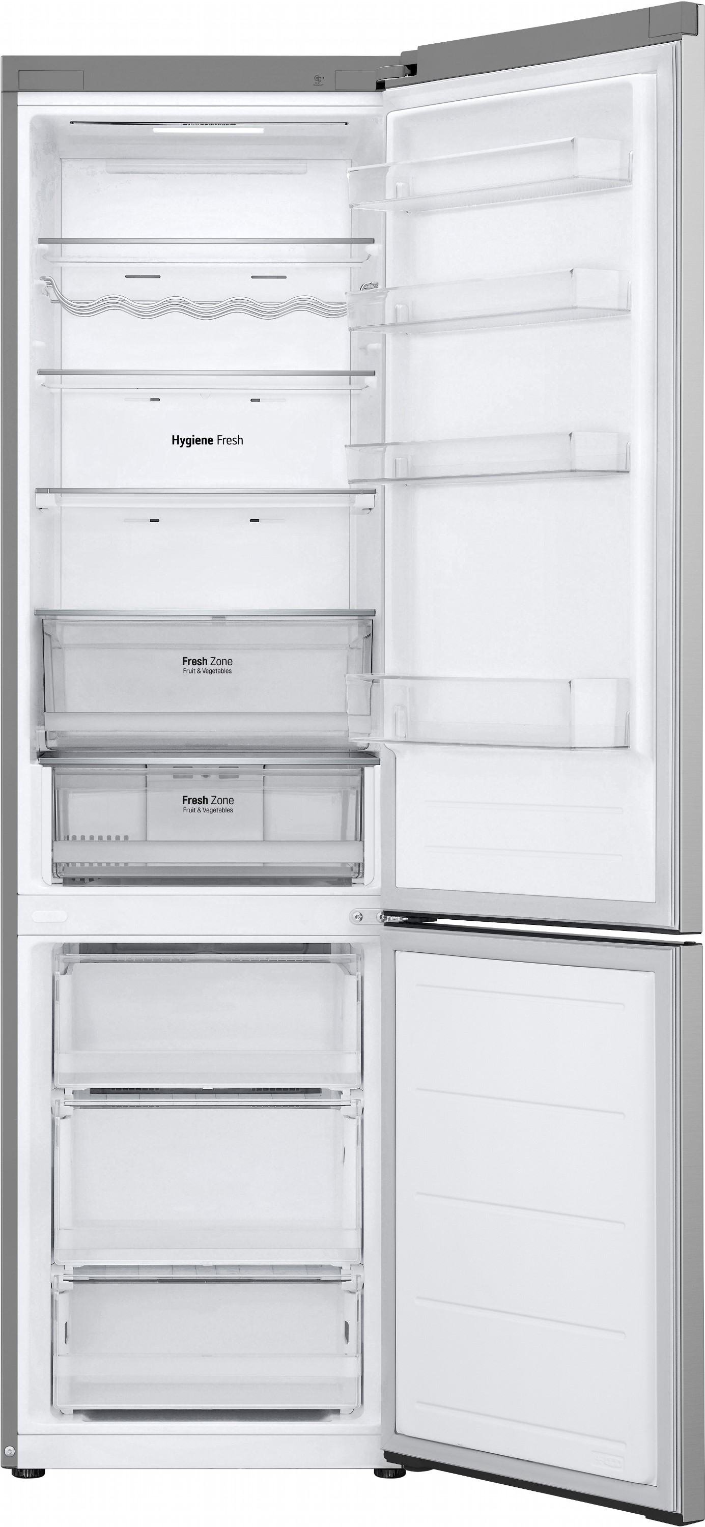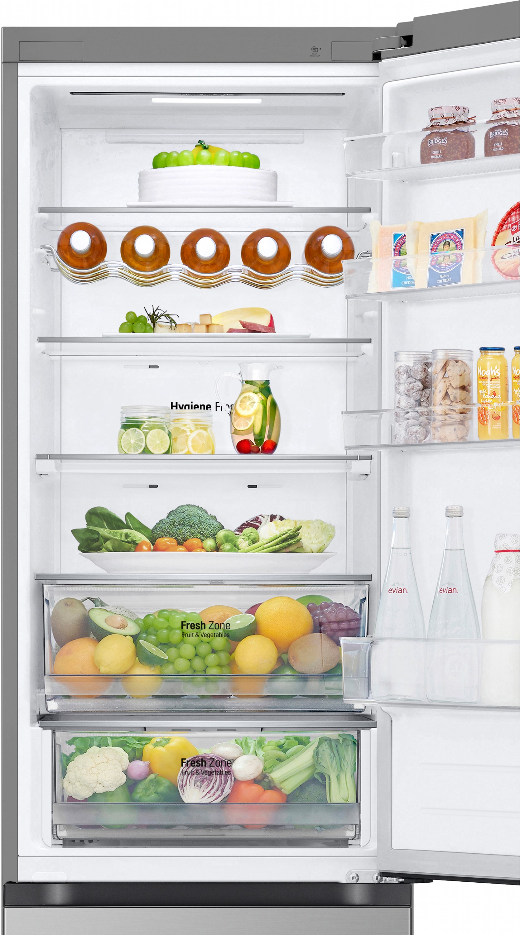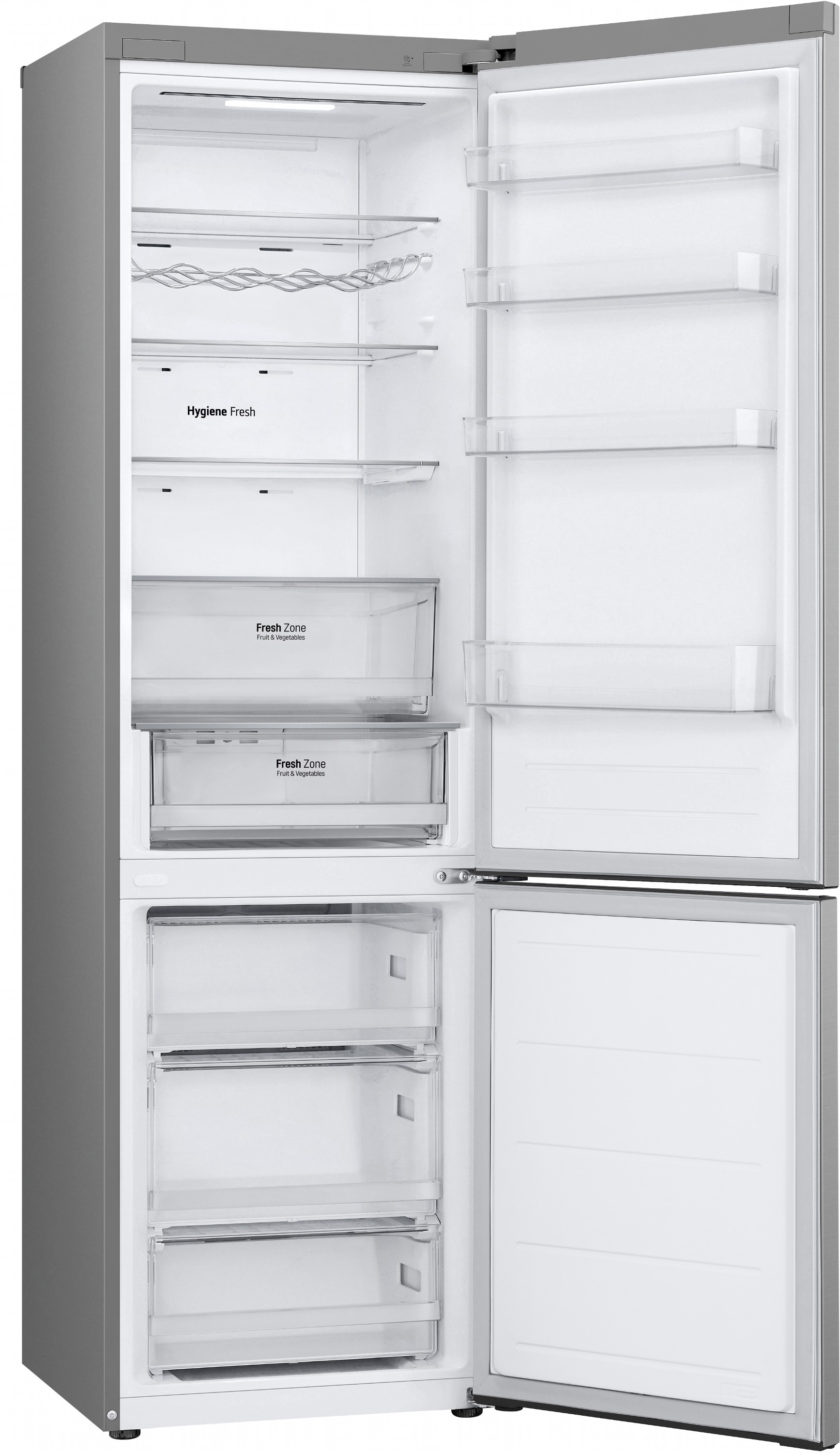 Total No Frost усуває потребу в розморожуванні й запобігає утворенню льоду, зберігаючи продукти свіжими довше. Зона свіжості Fresh Zone створена спеціально для м’яса, риби або овочів, утримуючи стабільно низьку температуру.