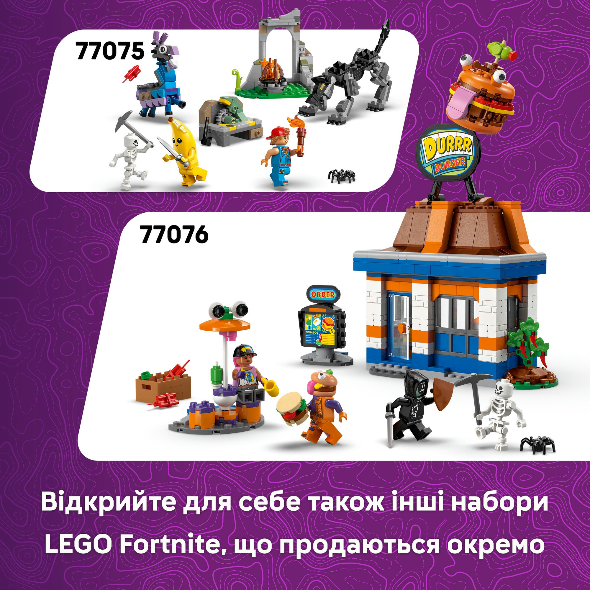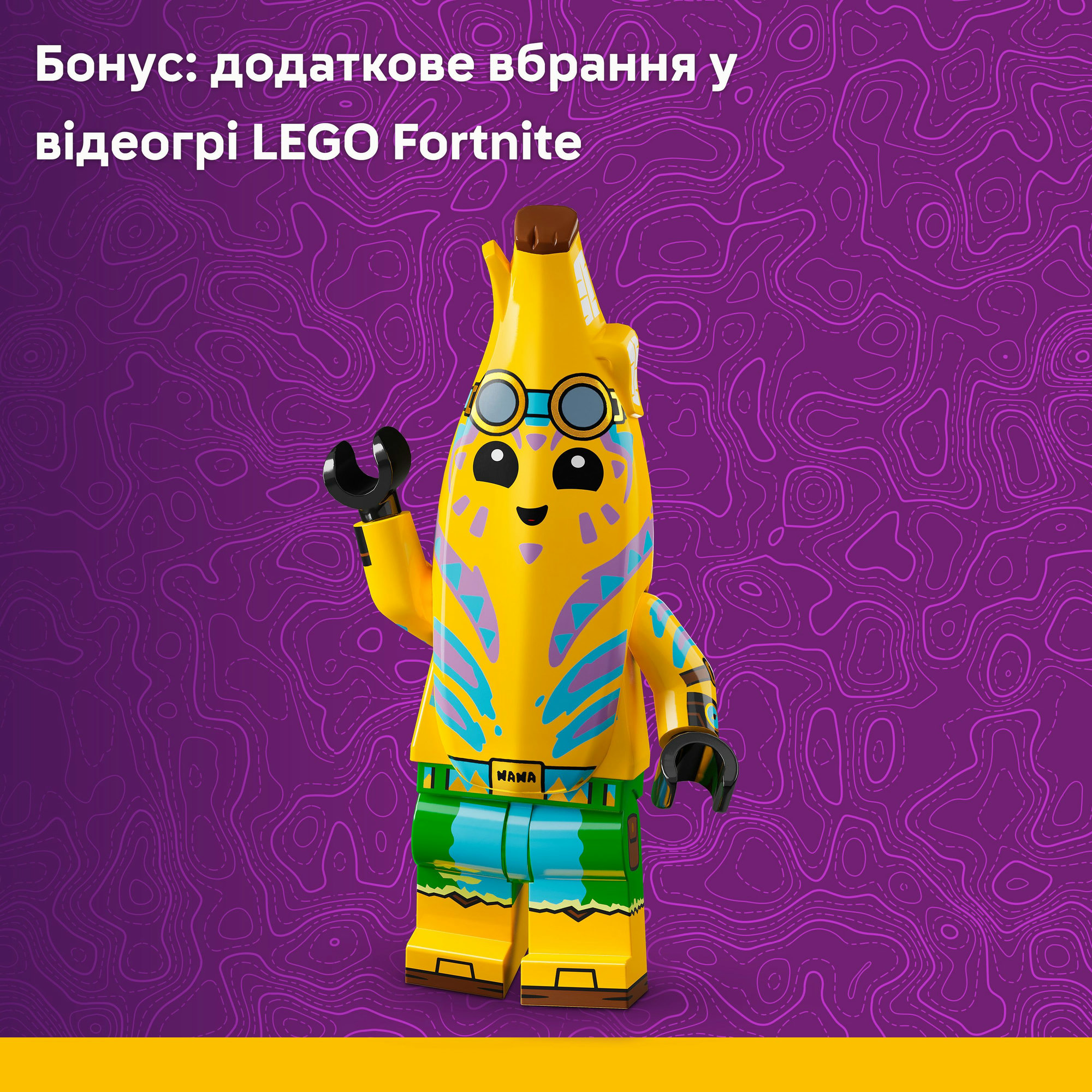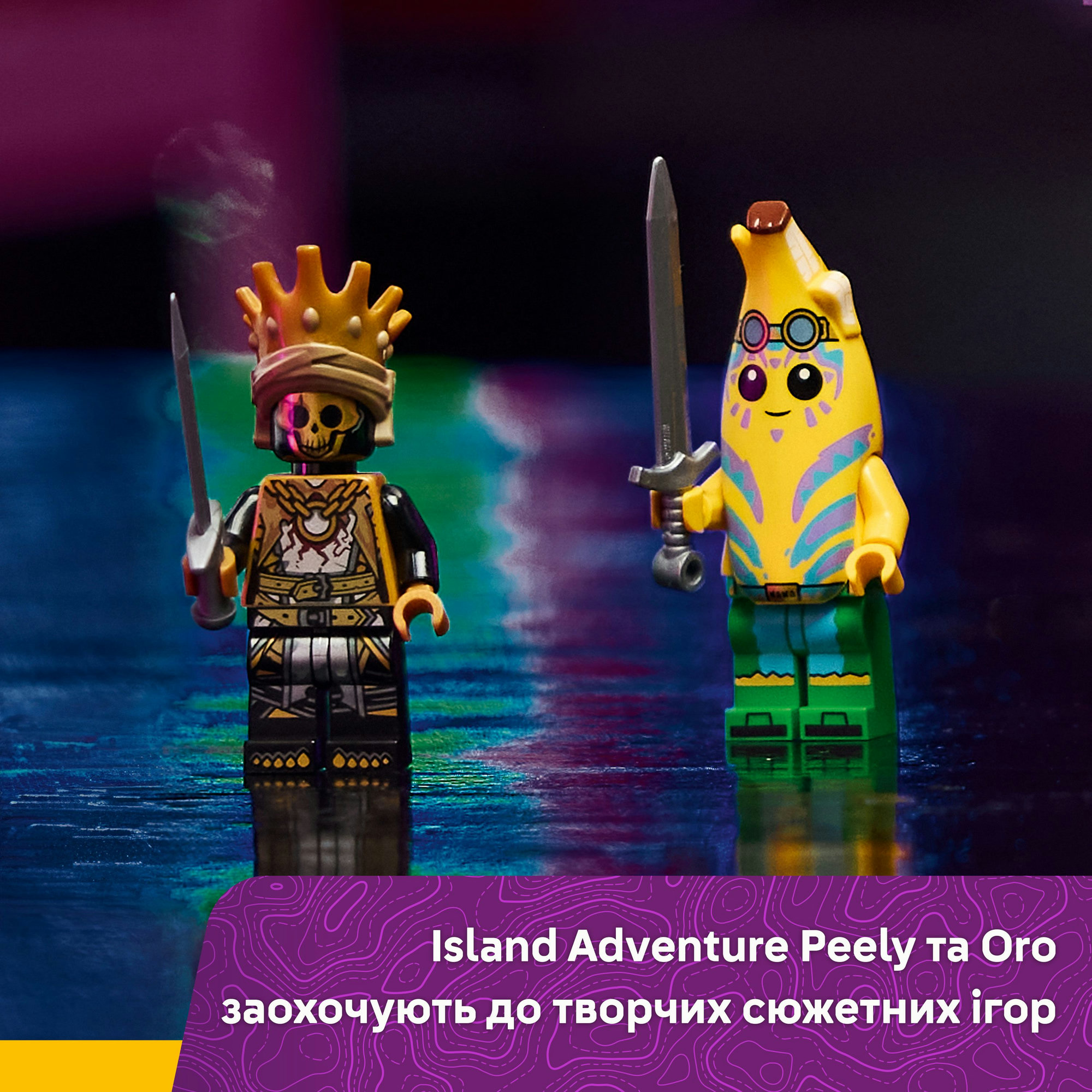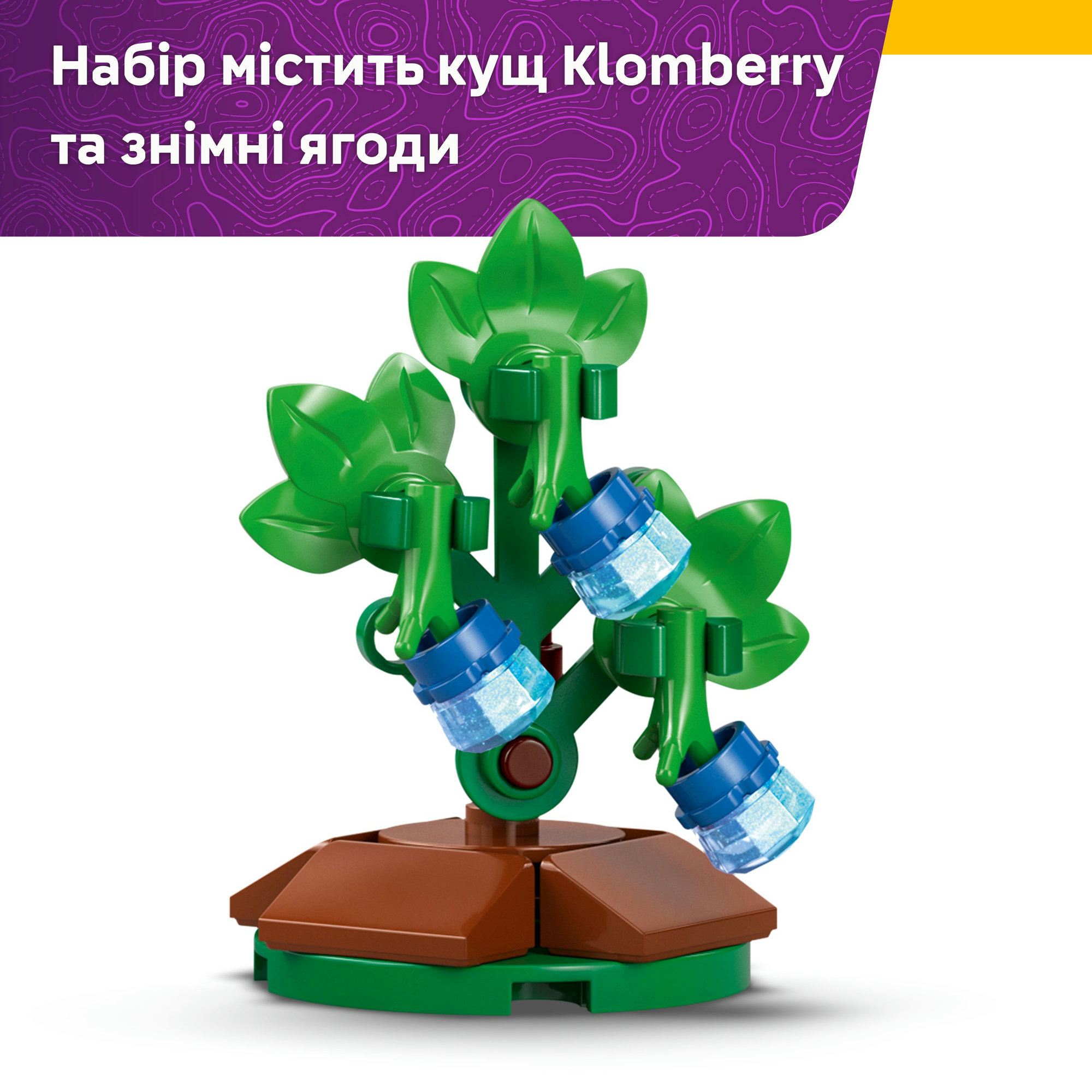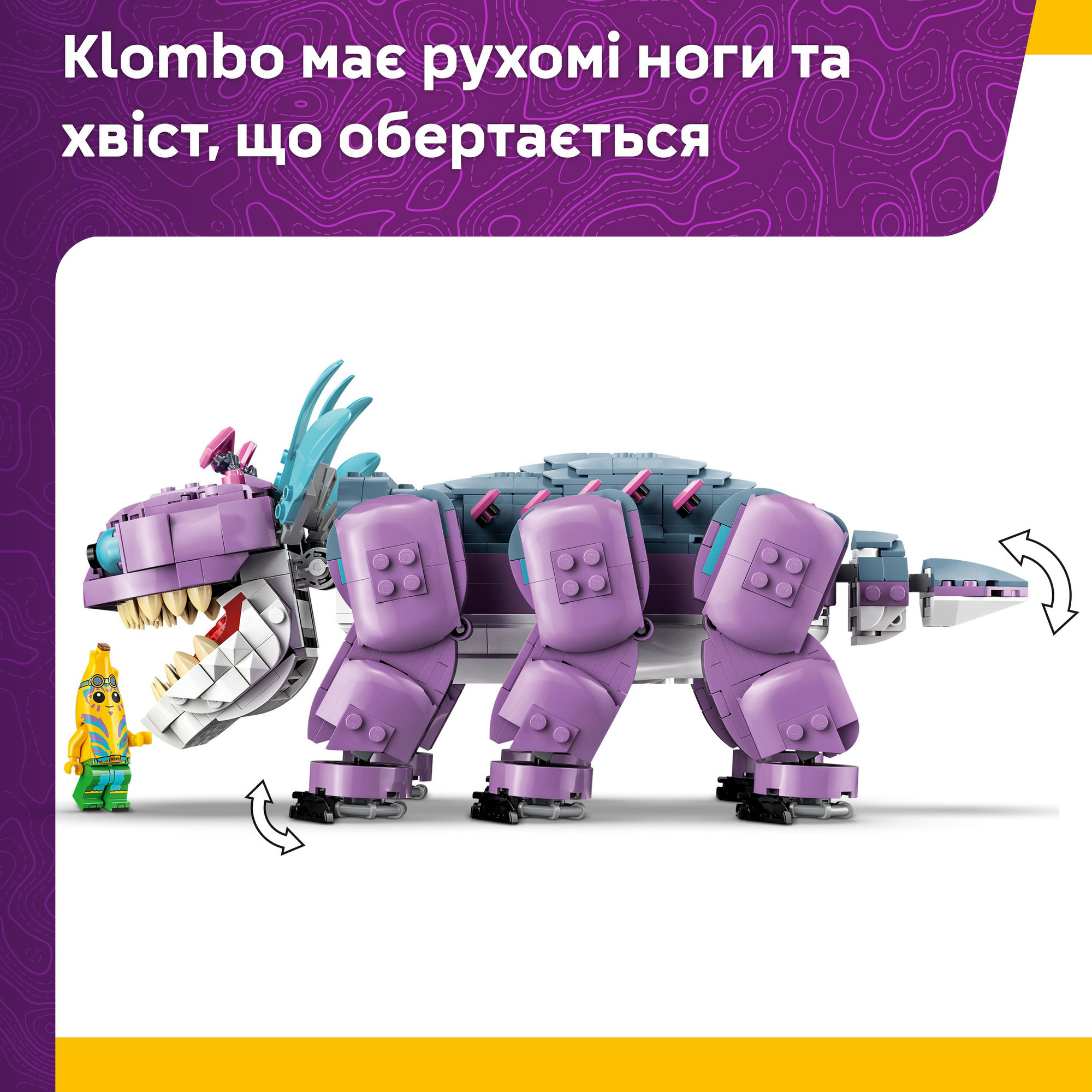 Готові до зустрічі з Klombo? Створіть власну версію істоти LEGO Fortnite за допомогою набору з безліччю деталей. Фігурка Klombo має рухомі кінцівки, рот, що відкривається, і хвіст, що обертається, а збоку є кущ Klomberry, щоб подражнити його, а потім нагодувати ягодами, аби подружитися з Klombo. До набору також входять мініфігурки Island Adventure Peely та Oro.