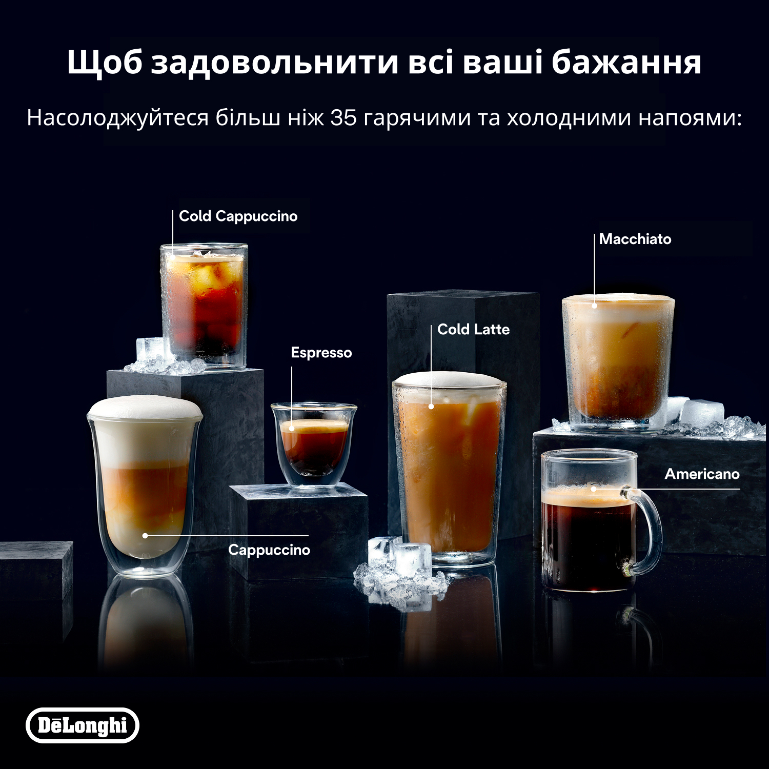 Найширший вибір напоїв, коли-небудь доступних в кавомашині De'Longhi (за винятком ToGo), ідеально підходить для будь-якої пори дня: еспресо, холодне заварювання, фільтр, молочні напої, гарячі, холодні, на рослинній основі, креативні рецепти та багато іншого.