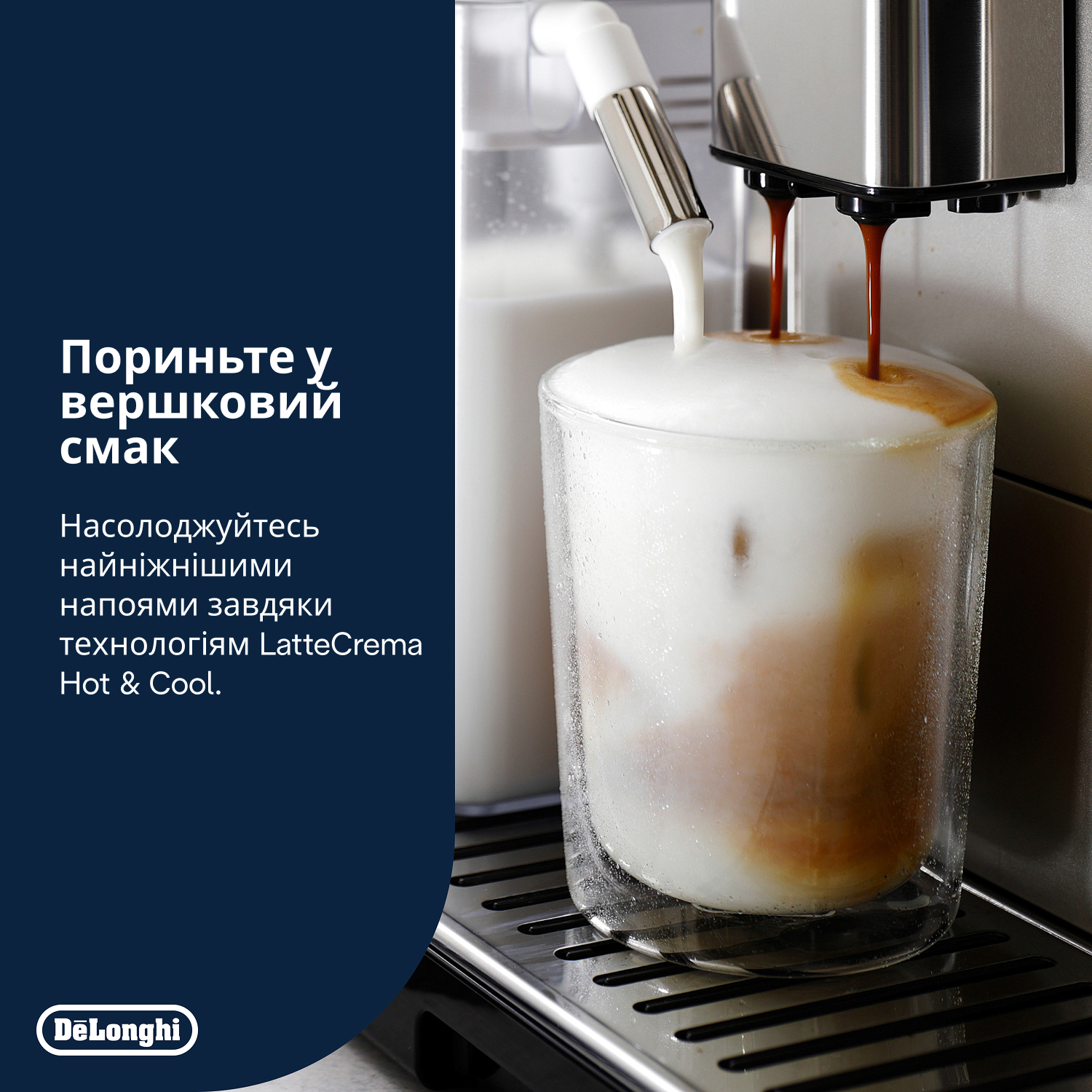 Задоволення від безлічі можливостей і якості, доступ до яких відкривається одним натисканням кнопки — без необхідності бути експертом, достатньо довіритися DeLonghi, чиї дослідження і знання втілені в цій ультрасучасній машині.