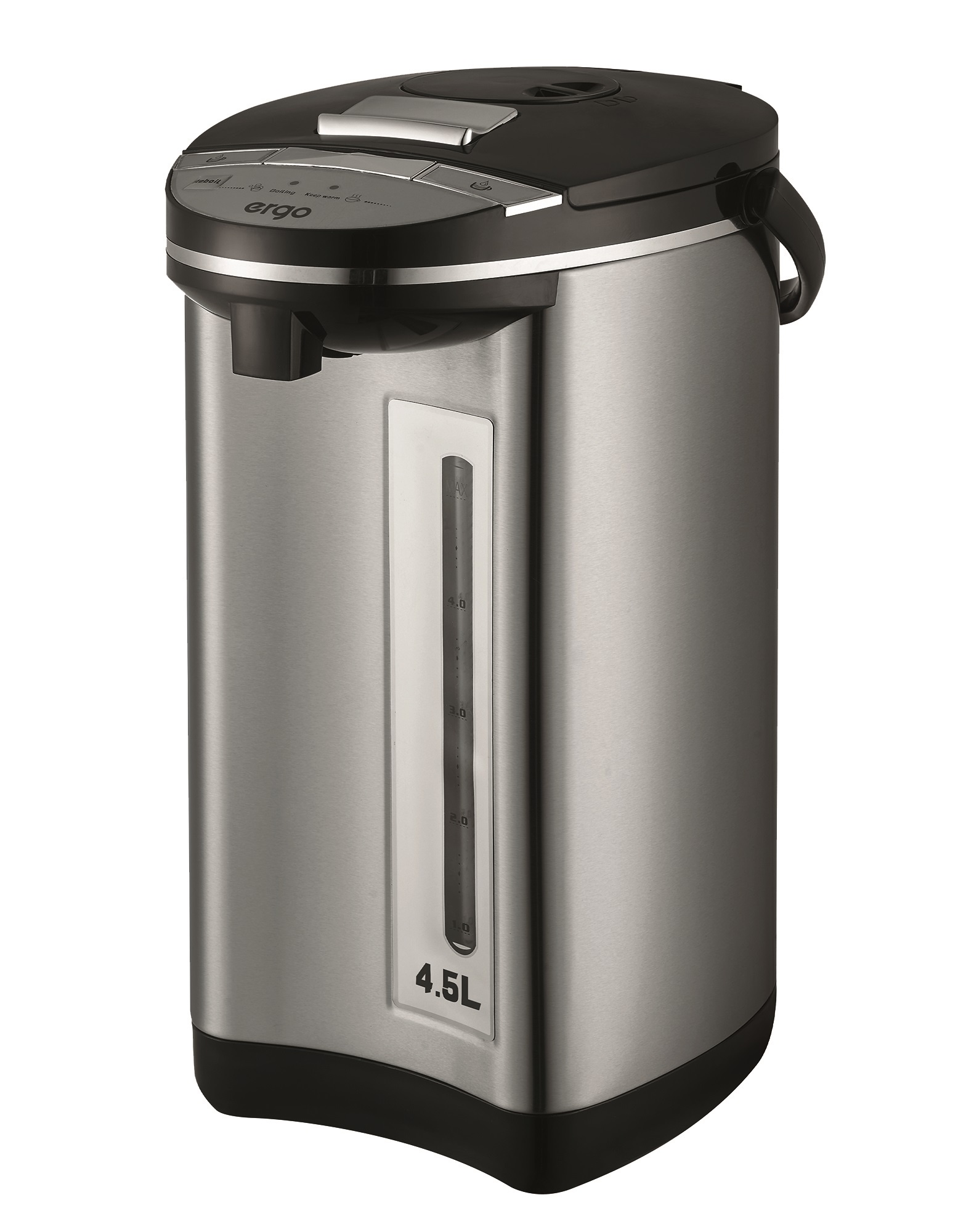 Міцний та стильний корпус моделі виготовлено з нержавіючої сталі й чорного пластику та оснащено якісною теплоізоляцією. Плаский нагрівальний дисковий елемент зручно очищувати від накипу, а кришка з силіконовим ущільнювачем не пропускає пару та додатково допомагає утримувати задану температуру. Завдяки потужності 750 Вт вода нагрівається швидко, водночас для підтримування заданої температури достатньо лише 35 Вт, що значно заощаджує витрати електроенергії. Для максимальної безпеки термопот ERGO 9090 має вбудований захист від перегрівання.
