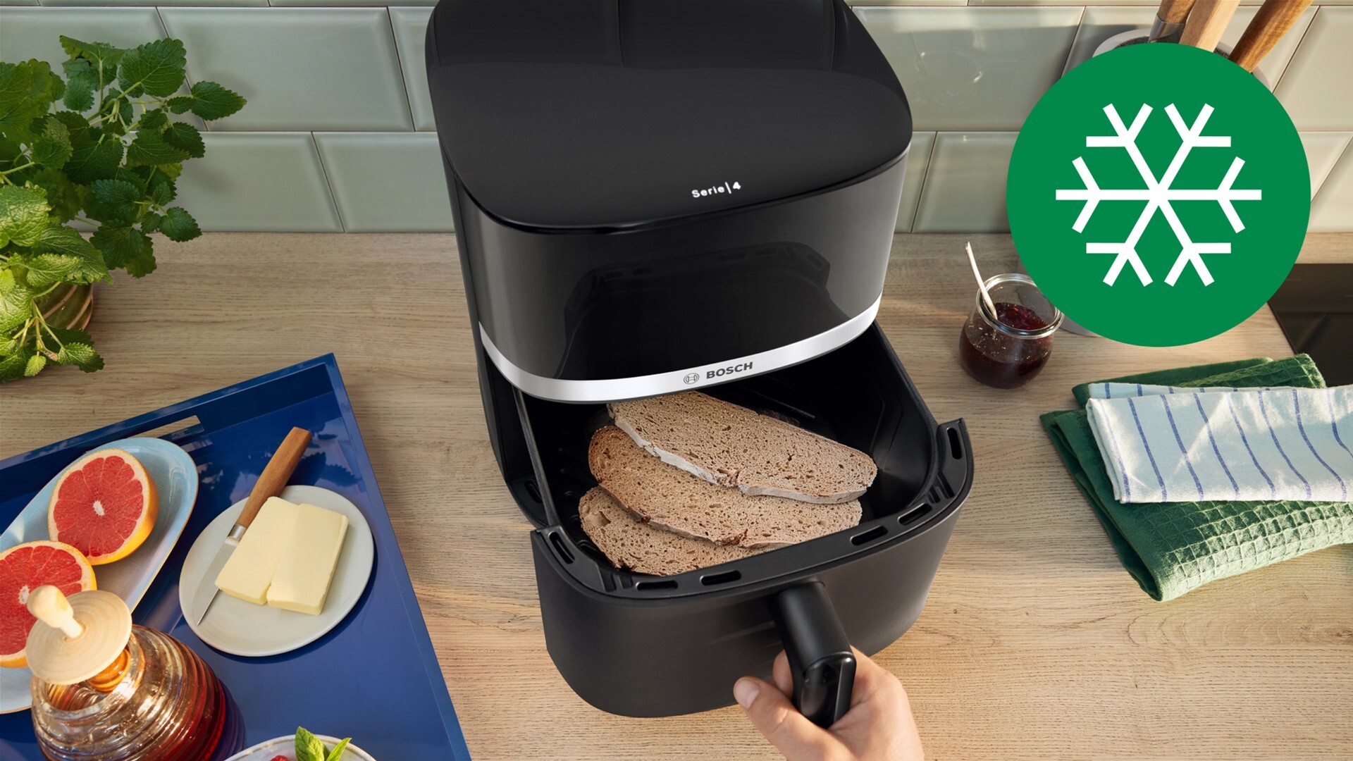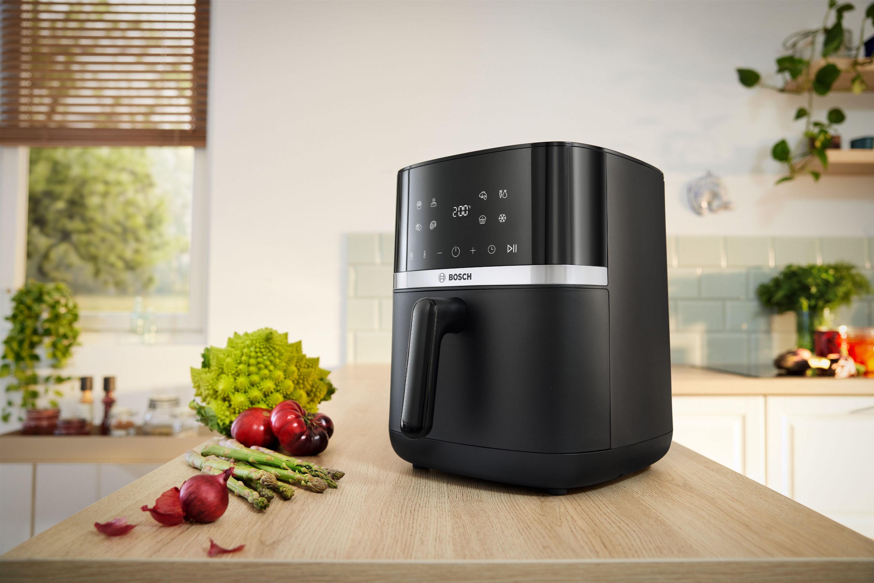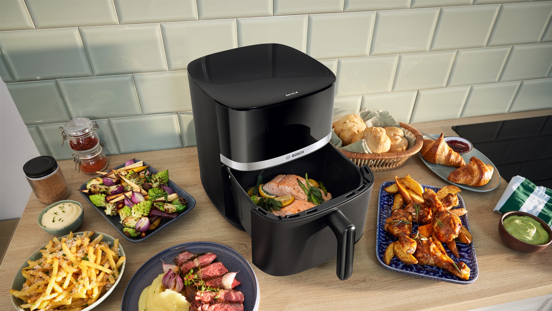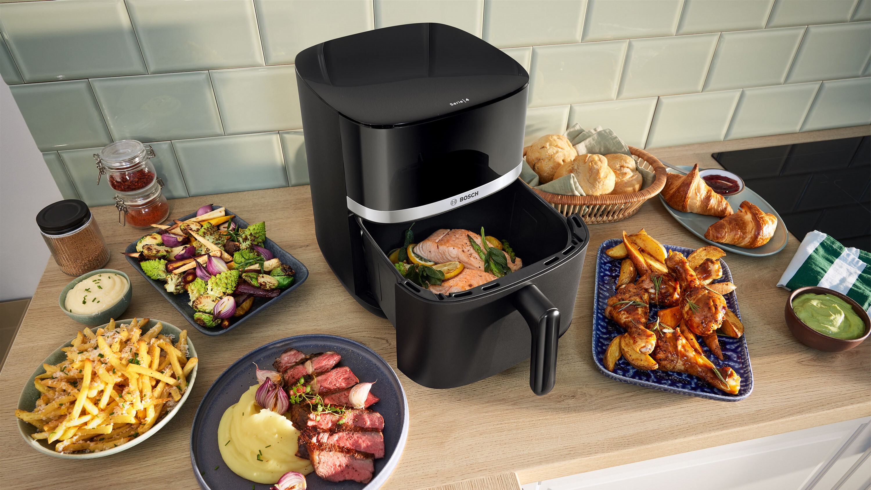 Мультипіч Bosch Serie 6 MAF462B0 – це сучасний кухонний прилад, що поєднує високу продуктивність, зручність та стильний дизайн. Завдяки технології швидкої циркуляції гарячого повітря вона забезпечує рівномірне приготування страв з усіх боків, створюючи апетитну золотисту скоринку зовні та зберігаючи соковитість усередині. Діапазон температур від 40°C до 200°C у поєднанні з подвійними нагрівачами дозволяє швидко готувати різноманітні страви, використовуючи мінімальну кількість олії або взагалі без неї. Велика чаша об’ємом 6.1 л підходить для приготування до чотирьох порцій за один раз, а 7 автоматичних програм (для картоплі фрі, м’яса, птиці, риби, овочів, кексів та булочок) роблять процес приготування максимально простим і зручним.