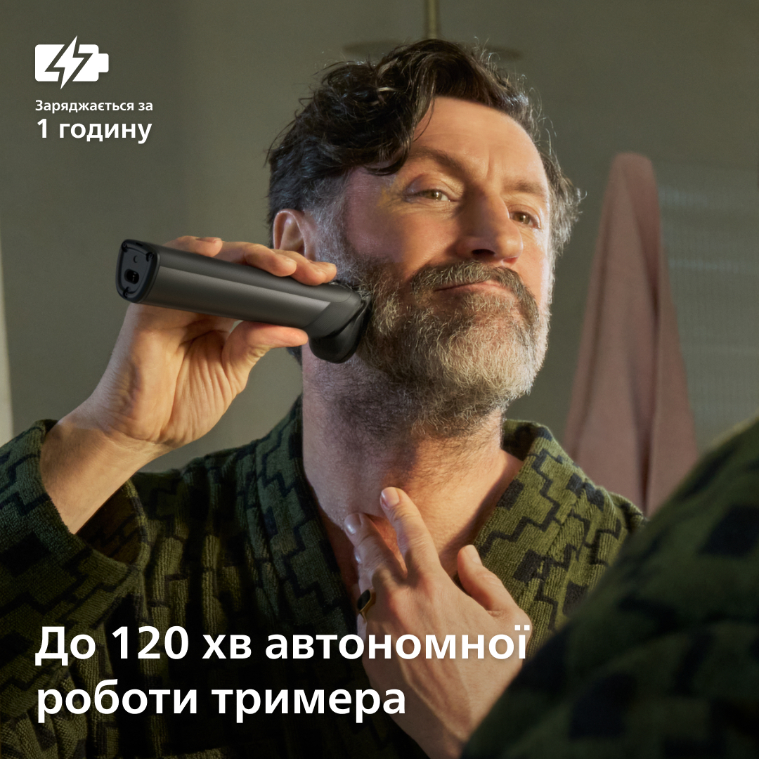 Акумулятор забезпечує до 120 хв роботи після 60‑хв заряджання через USB‑A, підтримує швидку 5‑хвилинну підзарядку для одного сеансу, а тример повністю водонепроникний для використання в душі (Wet & Dry) та має індикатор рівня заряду і подорожній замок.