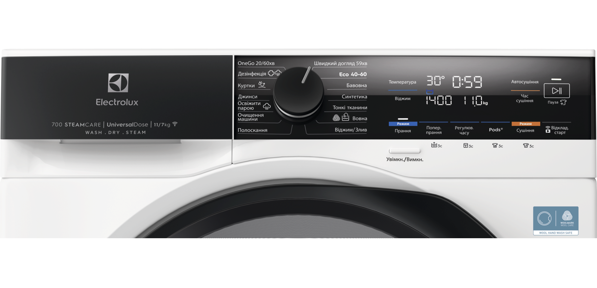 DualCare® дозволяє прати та сушити без хвилювань. Ця машина, сертифікована Woolmark Blue, з налаштованими температурою та рухами барабана ефективно пере та сушить навіть куртки та вовняні светри гарантовано без усадки.***