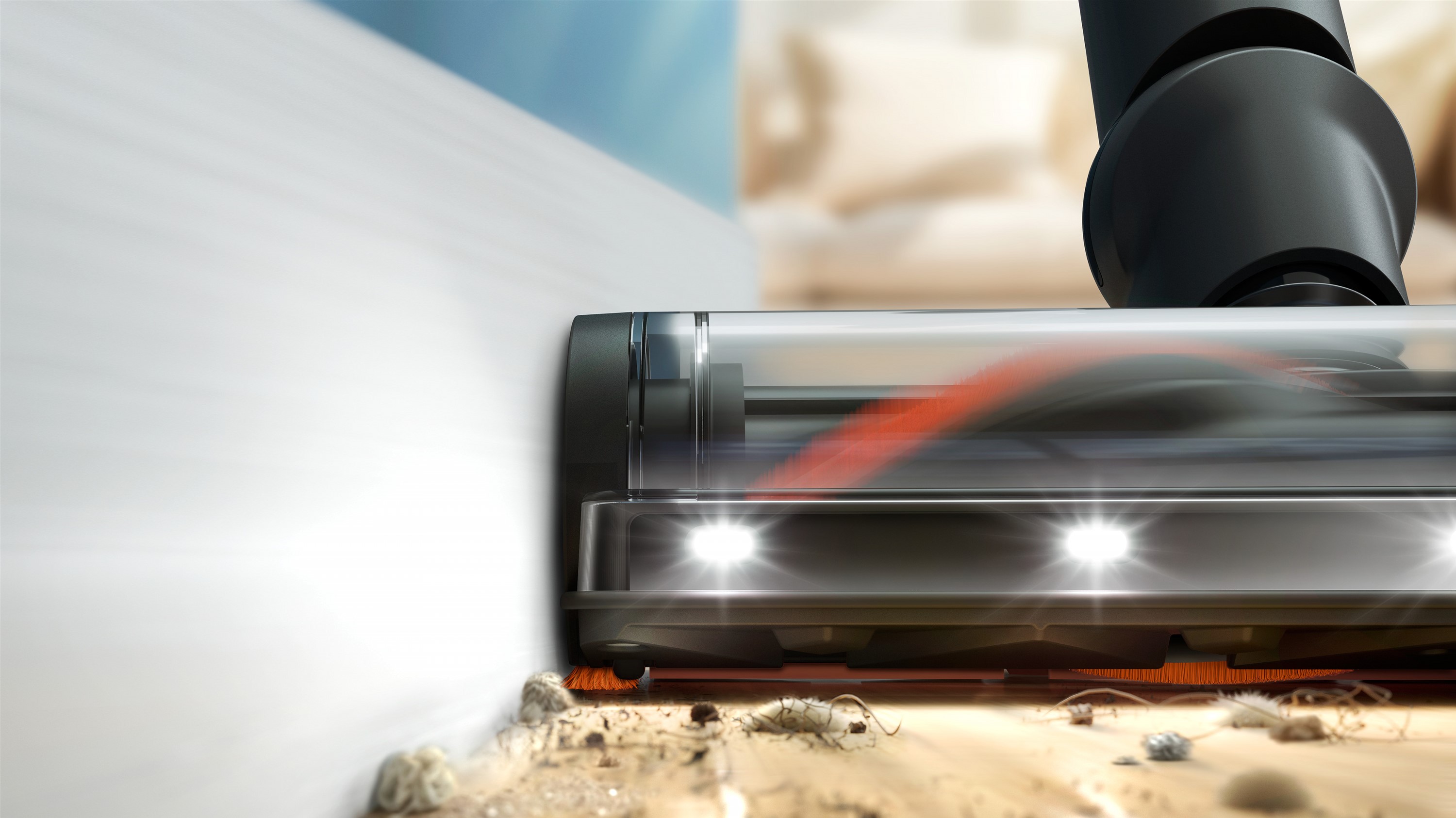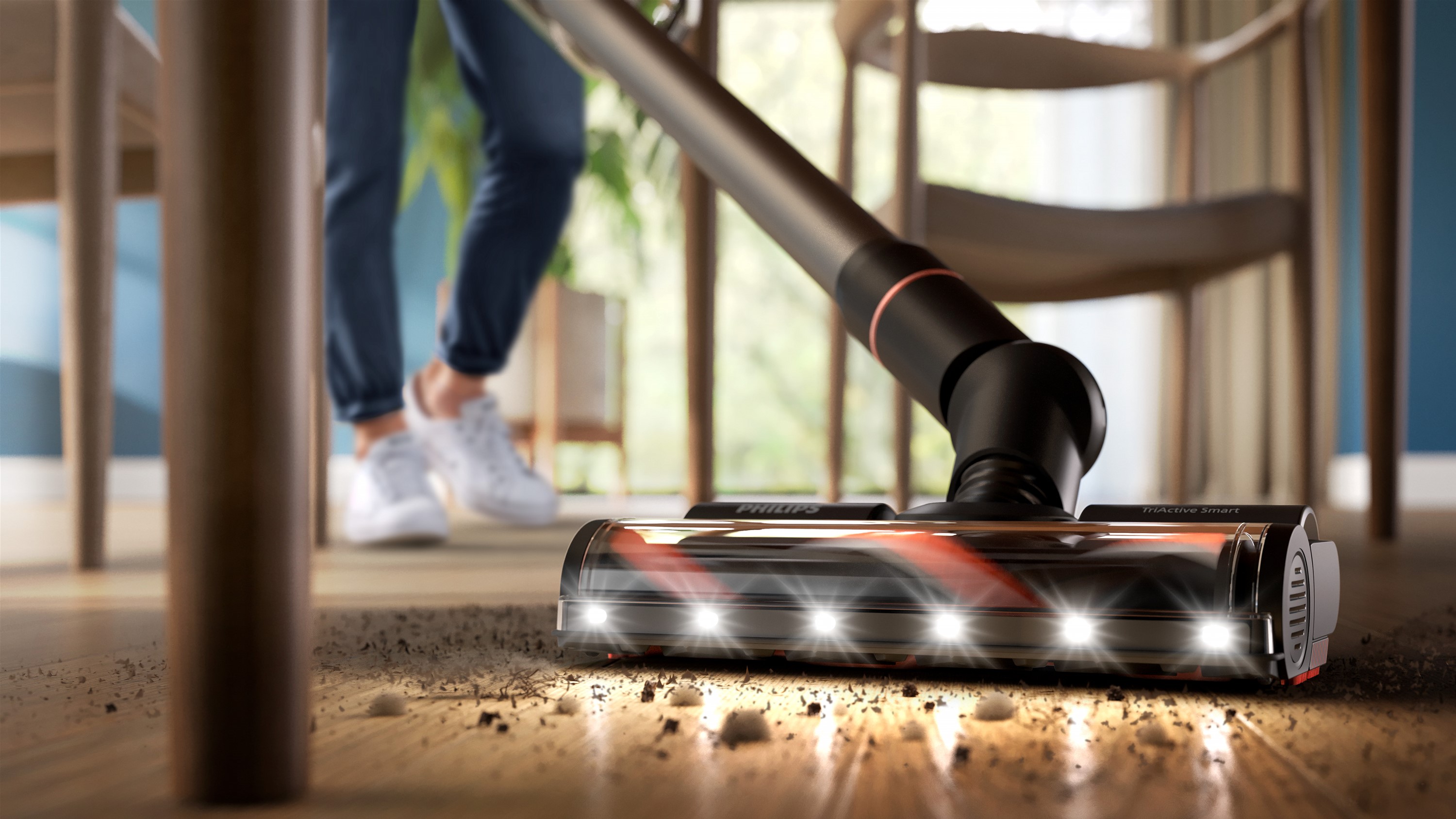 Розумна LED-насадка TriActive адаптовує потужність всмоктування залежно від типу підлоги для прибирання до 99,9% пилу та бруду за один прохід. Світлодіоди підсвічують пил і бруд, щоб ви нічого не пропустили.