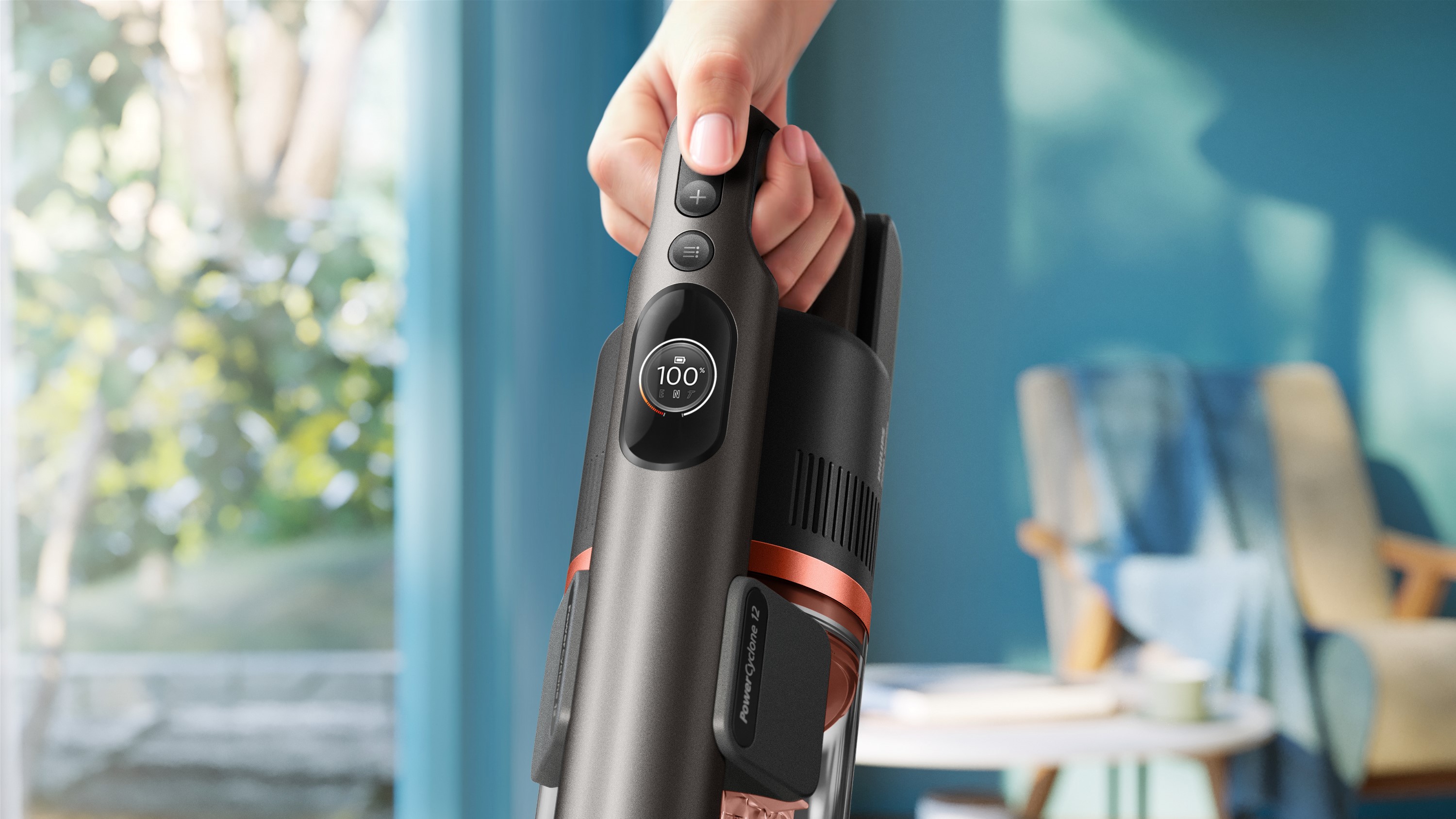 Технологія PowerCyclone 12 у поєднанні з цифровим двигуном PowerBlade забезпечує високу швидкість повітряного потоку — до 1080 л/хв — та енергоефективність. Потужне прибирання на будь-яких поверхнях без необхідності підзарядки батареї.