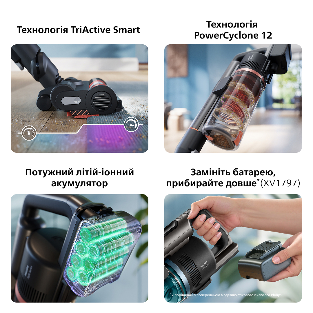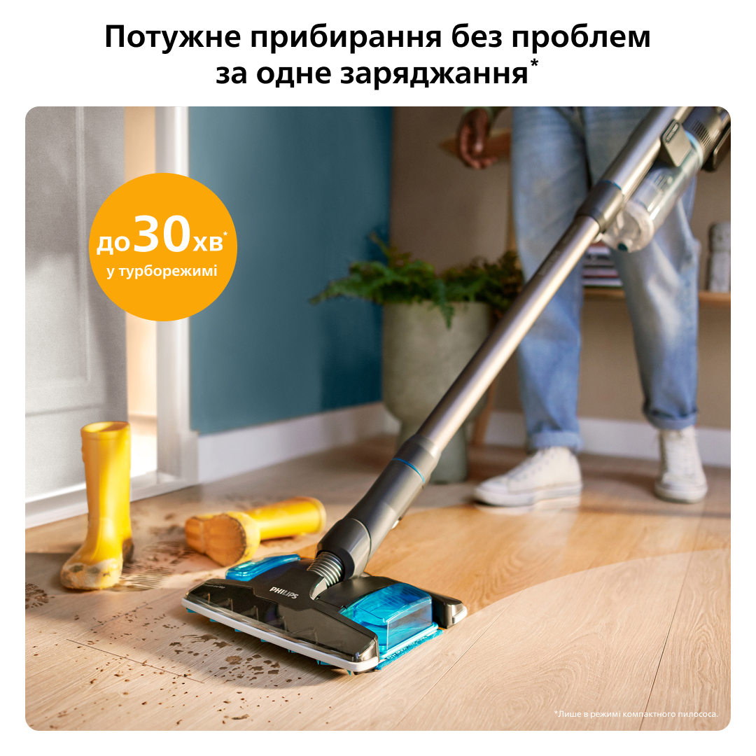 Упорайтеся з прибиранням за один раз! За один цикл заряджання пилососи Philips серії 8000 можуть прибрати понад 360 м2 в екорежимі та понад 135 м2 в турборежимі. Можна прибрати весь дім навіть у турборежимі. Можна придбати додаткові батареї та пристрій швидкої зарядки (XV1797), щоб збільшити площу прибирання вдвічі.