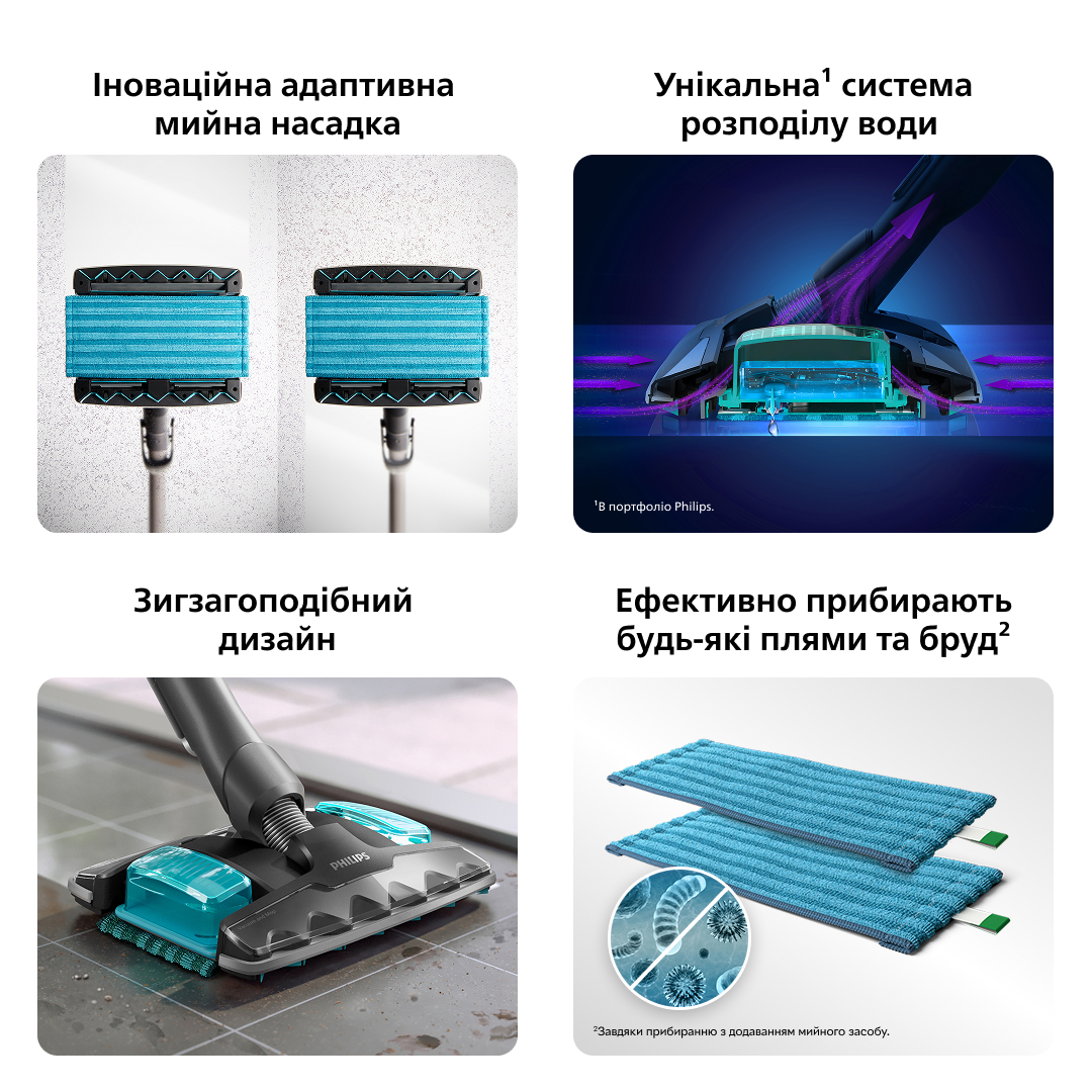 Хочете скоротити час прибирання вдвічі? Ось відповідь: пилососьте й мийте підлогу одним рухом, щоб видалити дрібний пил, плями та до 99% бактерій. Насадка нахиляється, щоб інтелектуально адаптувати силу всмоктування. Використовуючи подвійні канали всмоктування — один спереду, один ззаду — ви можете спочатку пилососити, а потім мити підлогу, незалежно від того, ведете ви пилососом уперед чи назад.