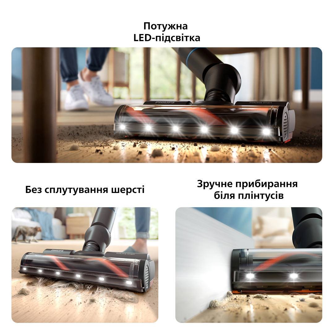 Розумна LED-насадка TriActive адаптує потужність всмоктування залежно від типу підлоги для прибирання до 99,9% пилу та бруду за один прохід. Світлодіоди підсвічують пил і бруд, щоб ви нічого не пропустили.