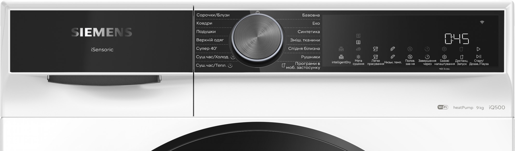 Сушильна машина Siemens iQ500 WQ42K200UA — це сучасний прилад із тепловим насосом, який поєднує високу ефективність, зручність керування та дбайливе ставлення до тканин. Максимальний об’єм завантаження становить 9 кг, що дозволяє комфортно сушити як повсякденний одяг, так і великогабаритні речі.
