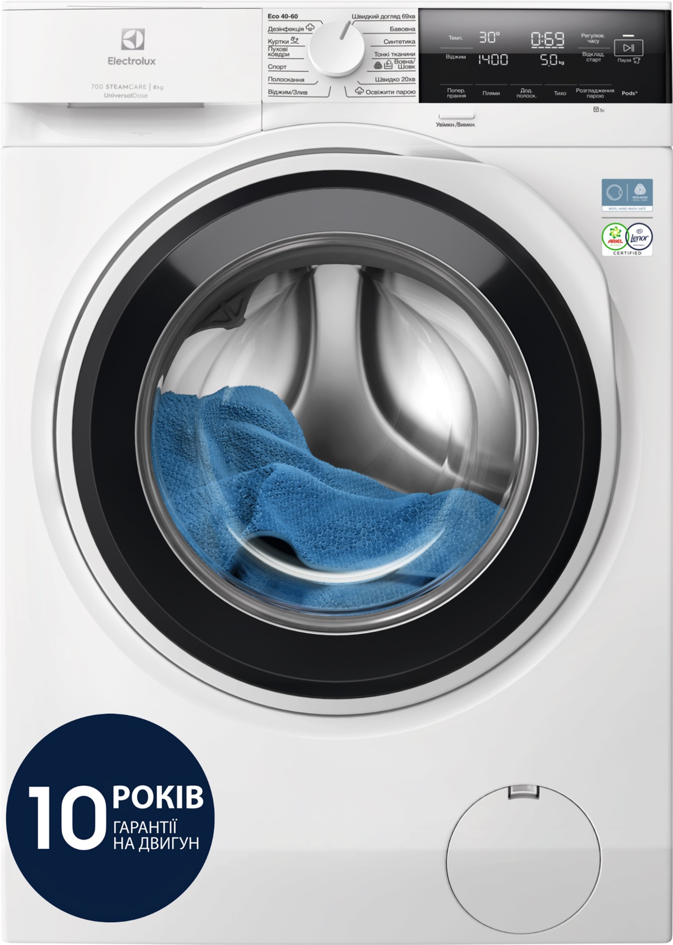 ** За результатами внутрішнього тестування витрат часу, води та енергії при завантаженні розміром 1 кг порівняно з максимальним завантаженням у режимі прання «Бавовна» за температури 30°C з використанням SensiCare, яка коригує програму залежно від розміру завантаження.