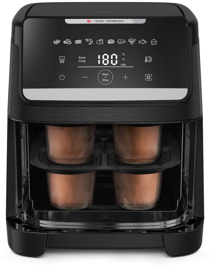 Безліч можливостей під рукою: сенсорне керування, регулювання температури (від 40°C до 220°C) та 10 автоматичних програм: картопля фрі, нагетси, бекон, креветки, запечена курка, піца, стейки, овочі, риба та випічка.