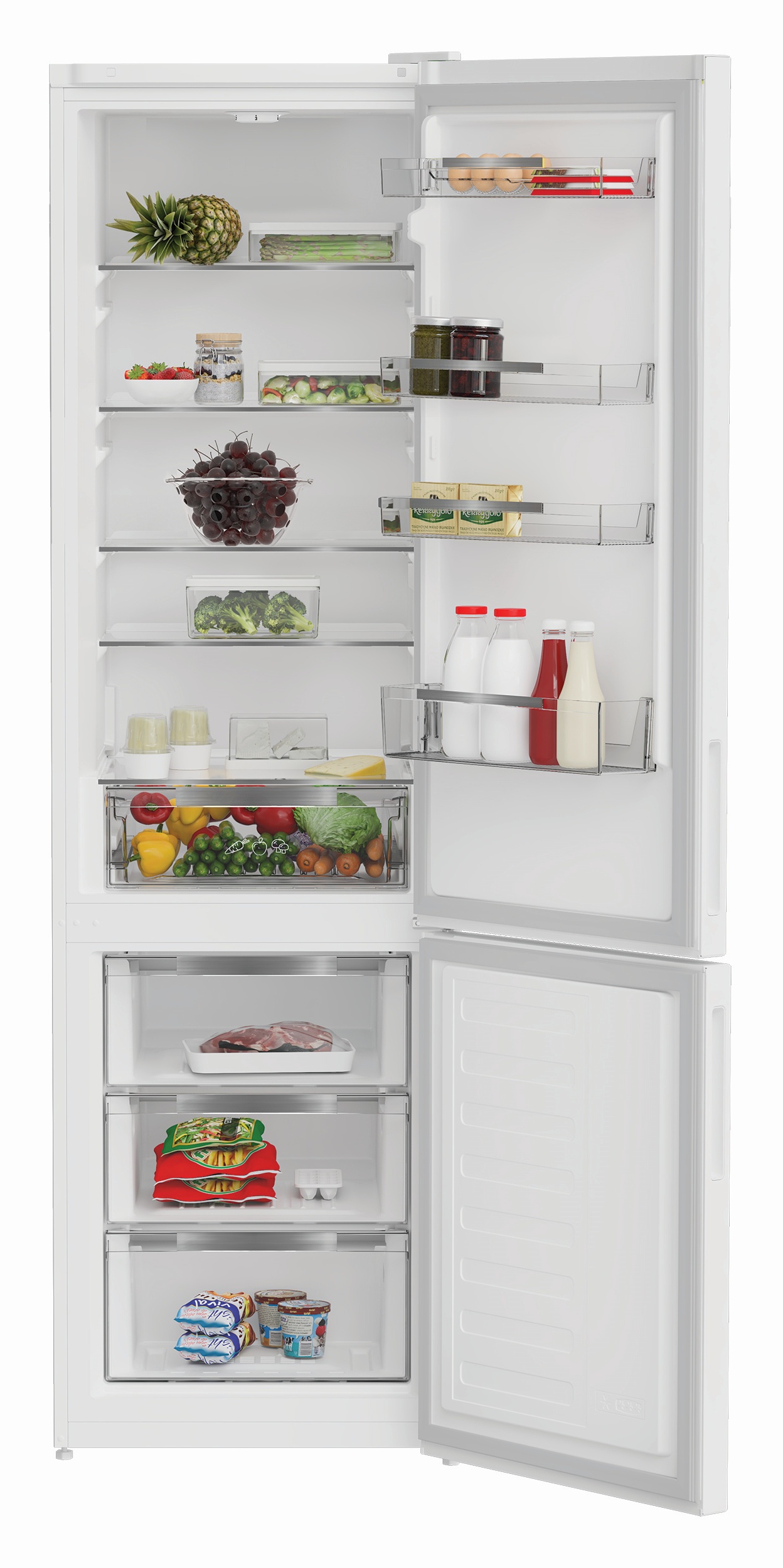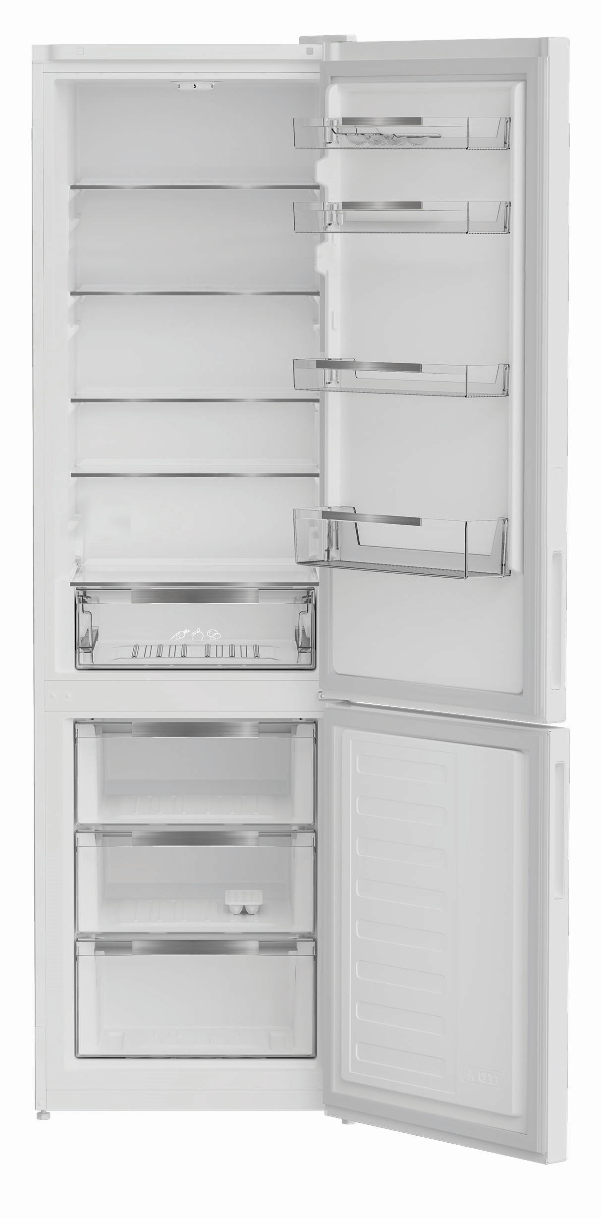 Загальний об’єм становить 386 літрів, з яких 266 л припадає на холодильне відділення, а 120 л — на морозильну камеру. Такий простір ідеально підходить для родини, адже дозволяє зручно розмістити всі продукти. Система статичного охолодження підтримує стабільну температуру в обох відділеннях, а нижнє розташування морозильної камери забезпечує легкий доступ до свіжих продуктів.
