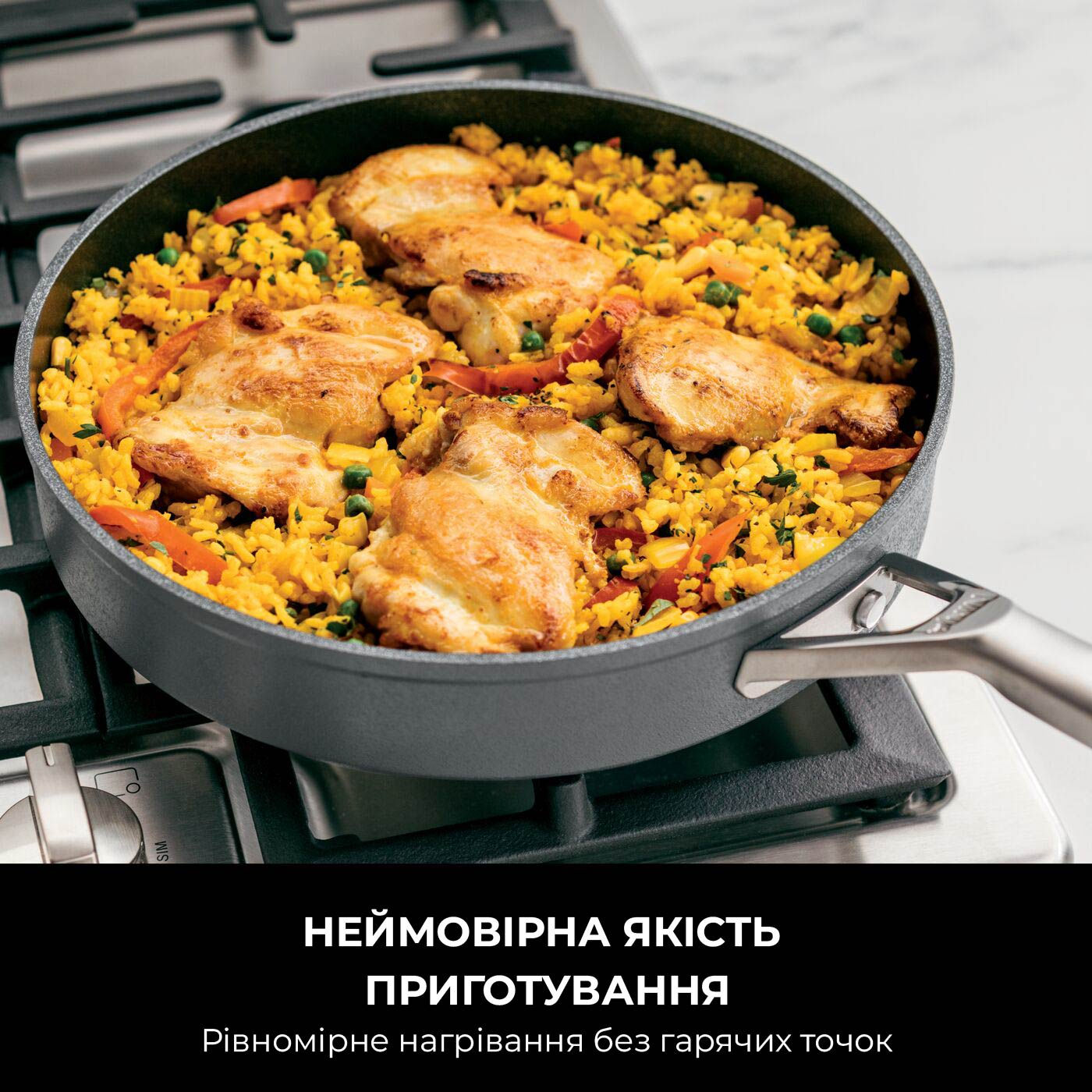 Завдяки технології Zerostick, ви можете готувати, використовуючи мінімум олії або й зовсім без неї. Їжа просто зісковзує з поверхні, що ідеально для приготування низькокалорійних страв. Важкий алюмінієвий корпус забезпечує рівномірний розподіл тепла та дозволяє смажити при високих температурах, отримуючи ідеально підсмажені стейки, як на нержавіючій сталі, золотисті млинці, ніжні омлети чи вишукану карамель.