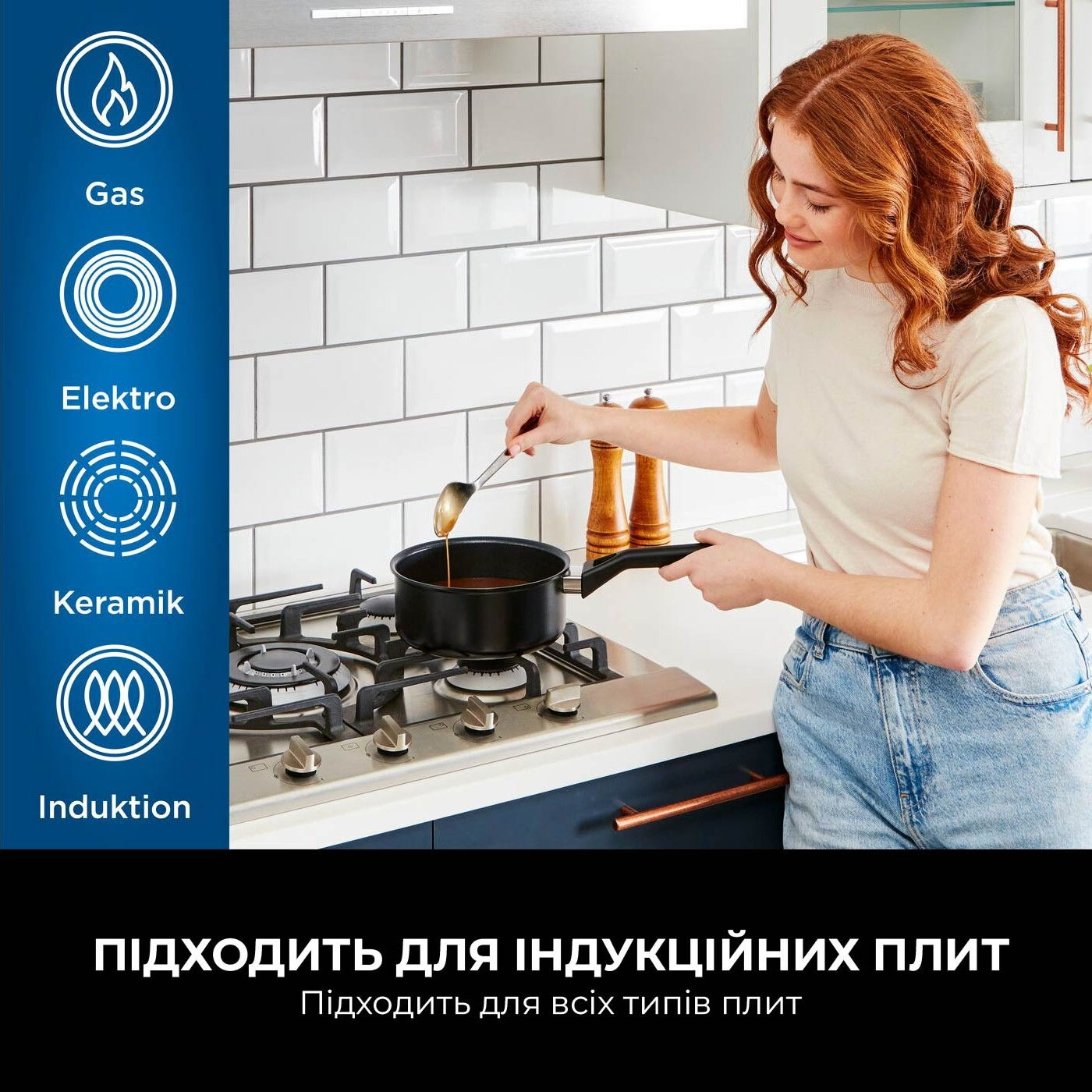 Підходить для всіх типів варильних поверхонь, включно з індукційними, газовими, електричними та керамічними. Ця 28-сантиметрова сковорода підходить для індукційної конфорки діаметром 18.75 см. Ви користуєтеся індукційною плитою? Чи знали ви, що розмір вашої каструлі може впливати на ефективність приготування? Завжди переконайтеся, що розмір каструлі відповідає розміру зони нагріву, оскільки індукційна технологія працює ефективно лише тоді, коли дно каструлі або сковороди має такий самий розмір, як і конфорка на плиті. Якщо дно вашої каструлі менше за зону нагріву, плита може її не розпізнати.