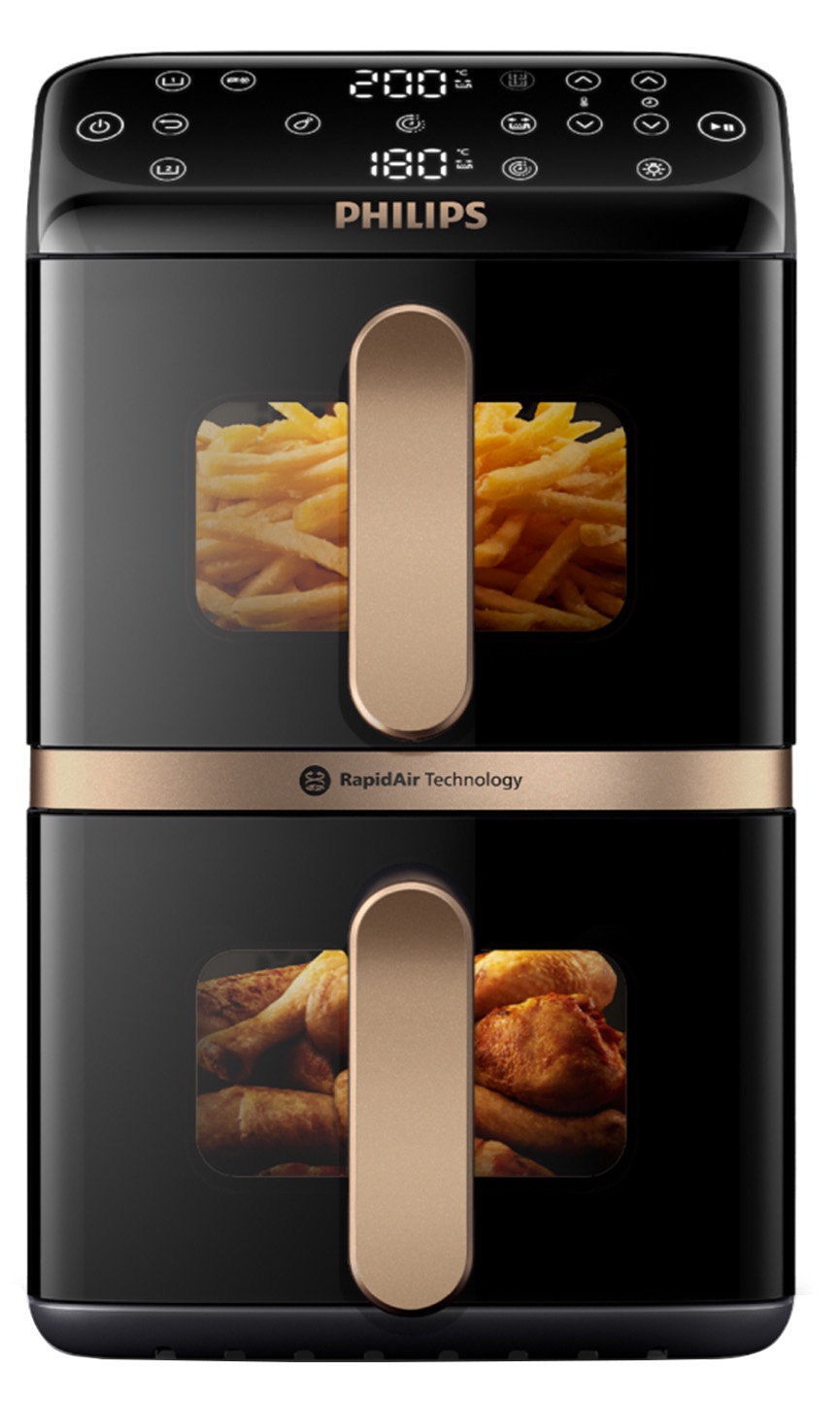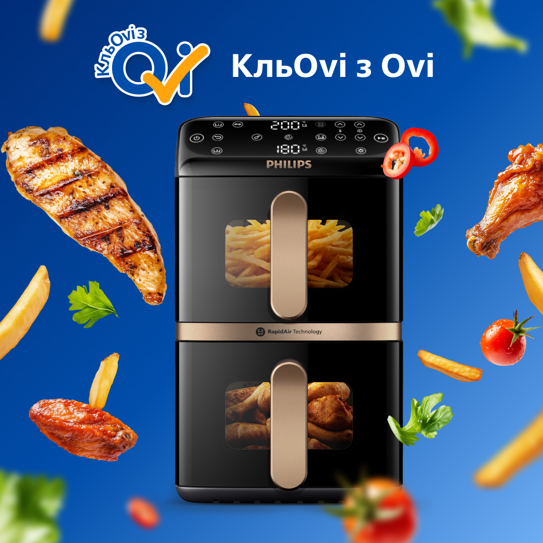 Philips Ovi Stacked Dual Basket має нове антипригарне покриття без PFAS, яке є міцним, стійким до подряпин і легким у догляді. Усі знімні частини можна мити в посудомийній машині. Прилад забезпечує до 40% швидше приготування та до 65% економії енергії у порівнянні зі звичайною духовкою.