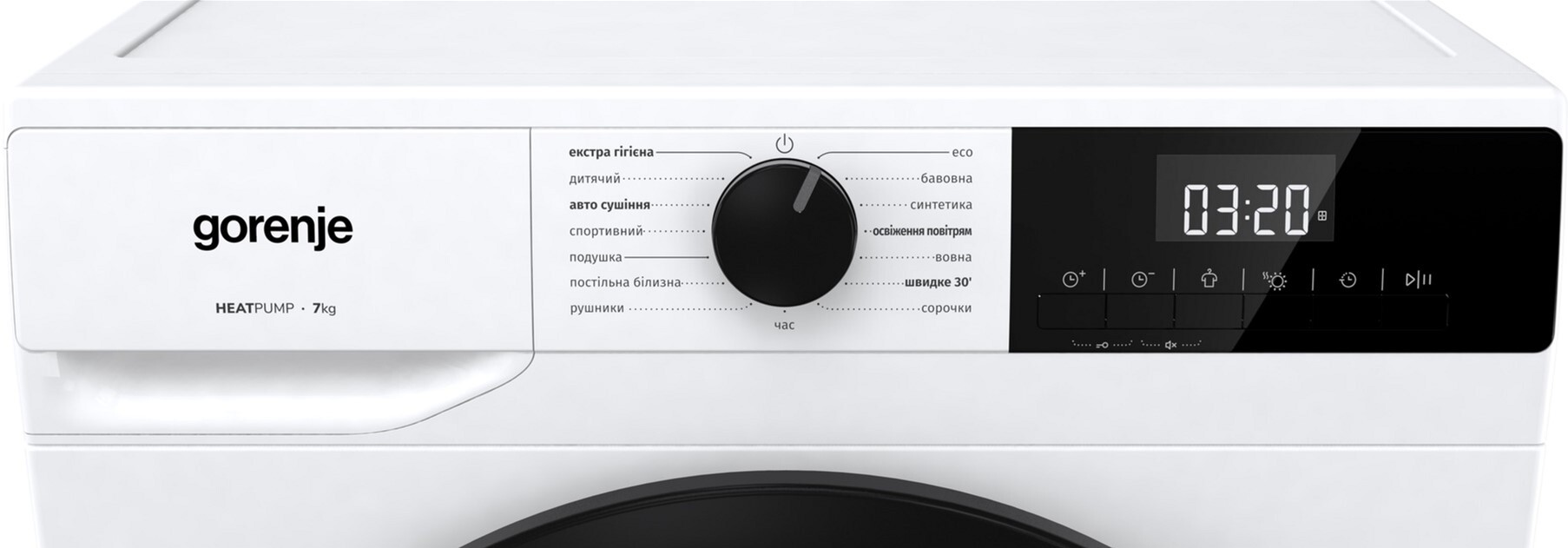 Сушильна машина оснащена 15 програмами, серед яких є режими для бавовни, синтетики, рушників, вовни, постільної білизни, спортивного одягу, а також коротке сушіння за 30 хвилин і програма Екстра гігієна. Передбачені додаткові функції — антизминання (Anticrease), затримка старту, експрес-сушіння, освітлення барабана та захист від дітей, що робить користування зручним і безпечним.