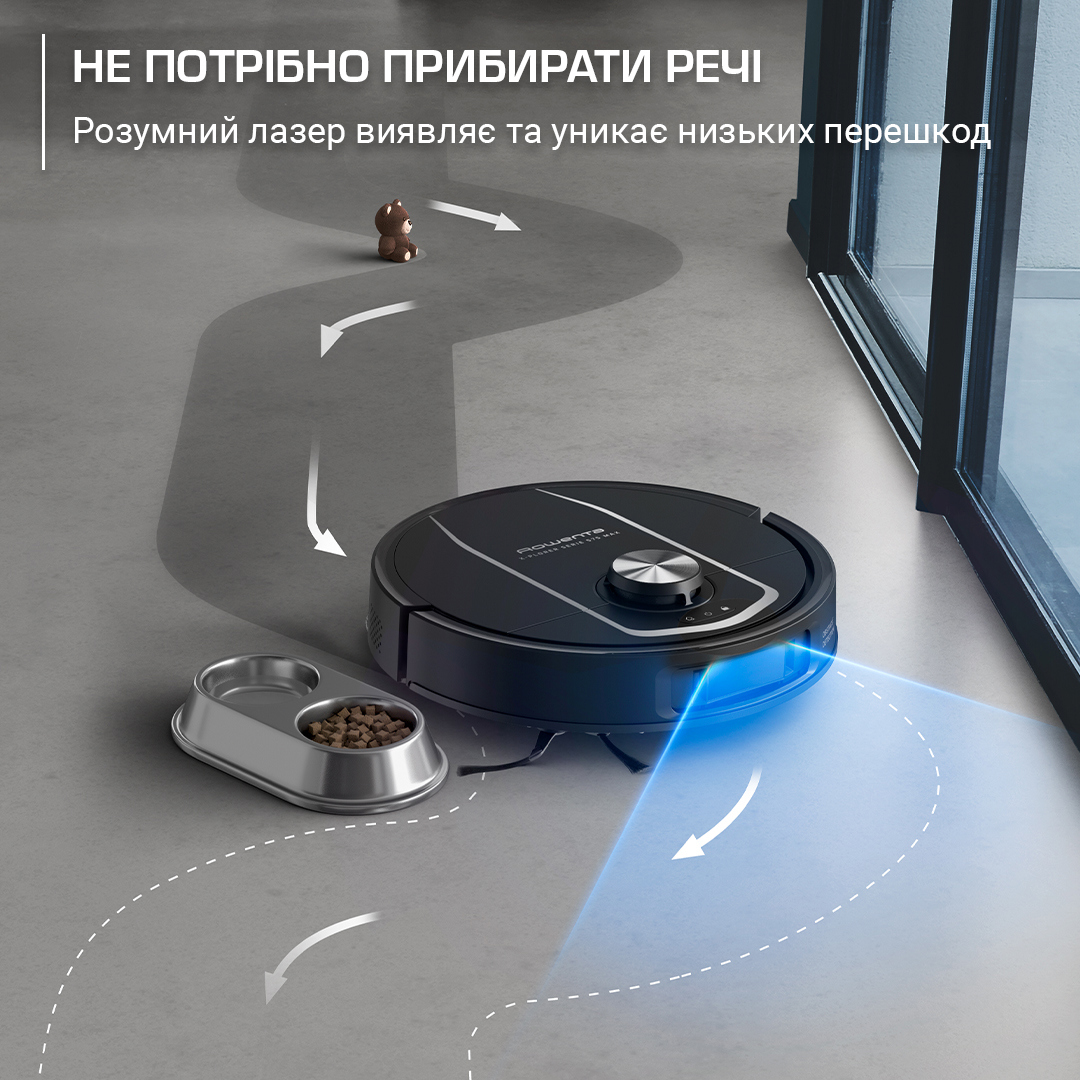 Інтелектуальний лазер розпізнає та оминає низькі перешкоди — іграшки, миски для тварин та інші предмети — забезпечуючи ідеальне прибирання без вашої участі.