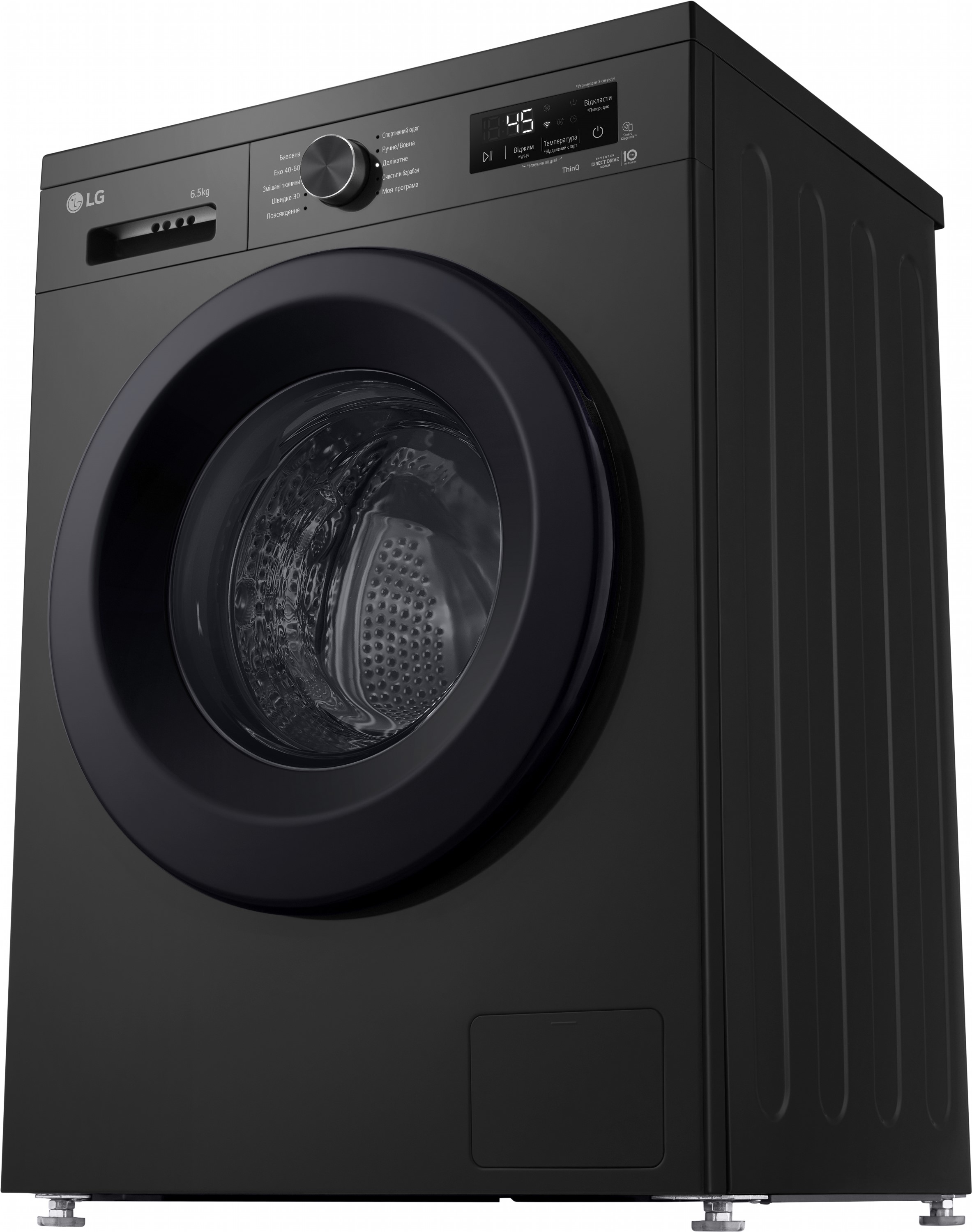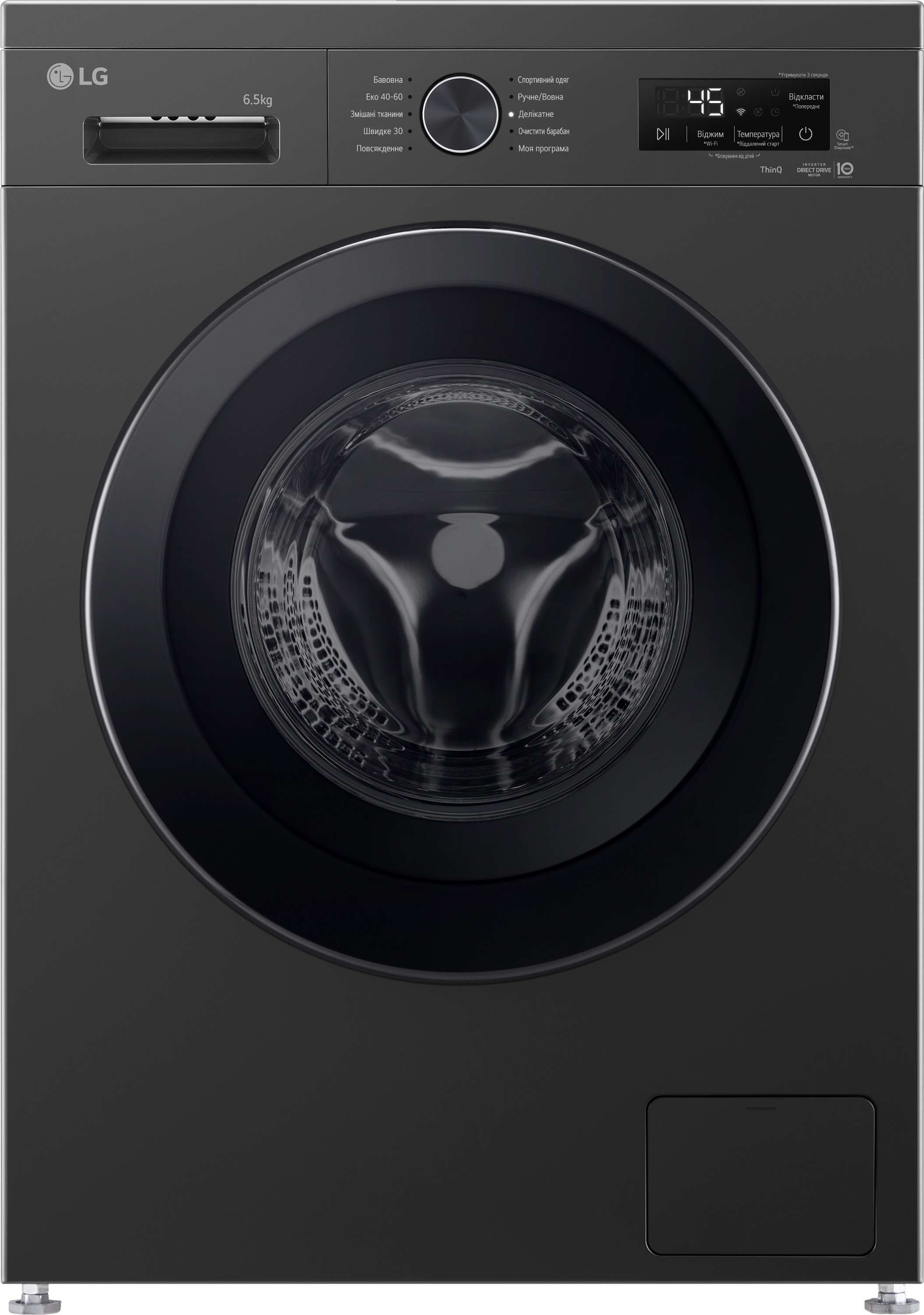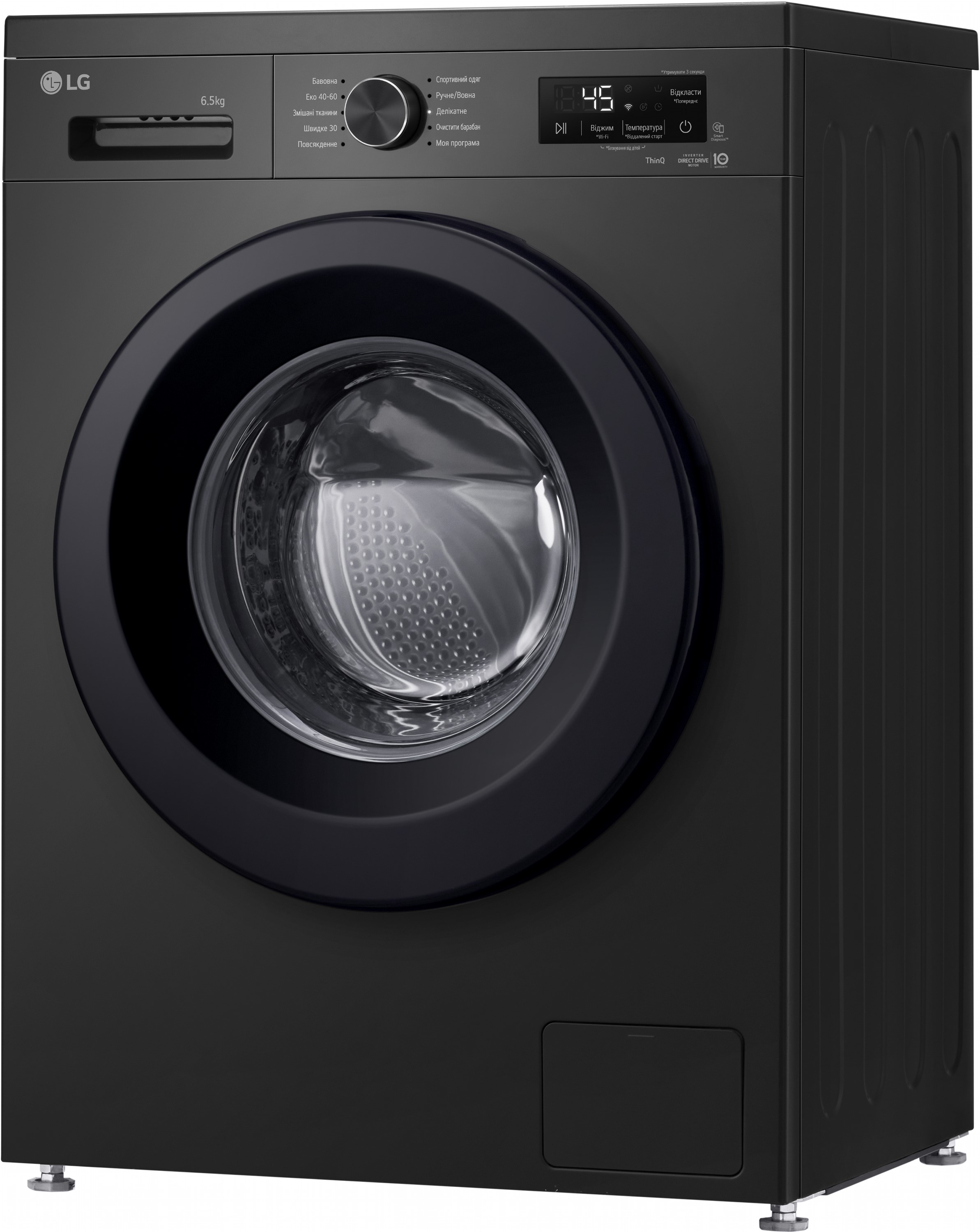 Модель підтримує LG ThinQ (Wi-Fi), що дозволяє керувати пральною машиною дистанційно, контролювати роботу та завантажувати додаткові програми. Для стабільної роботи передбачена технологія контролю напруги (174–400 В) та система контролю піноутворення.