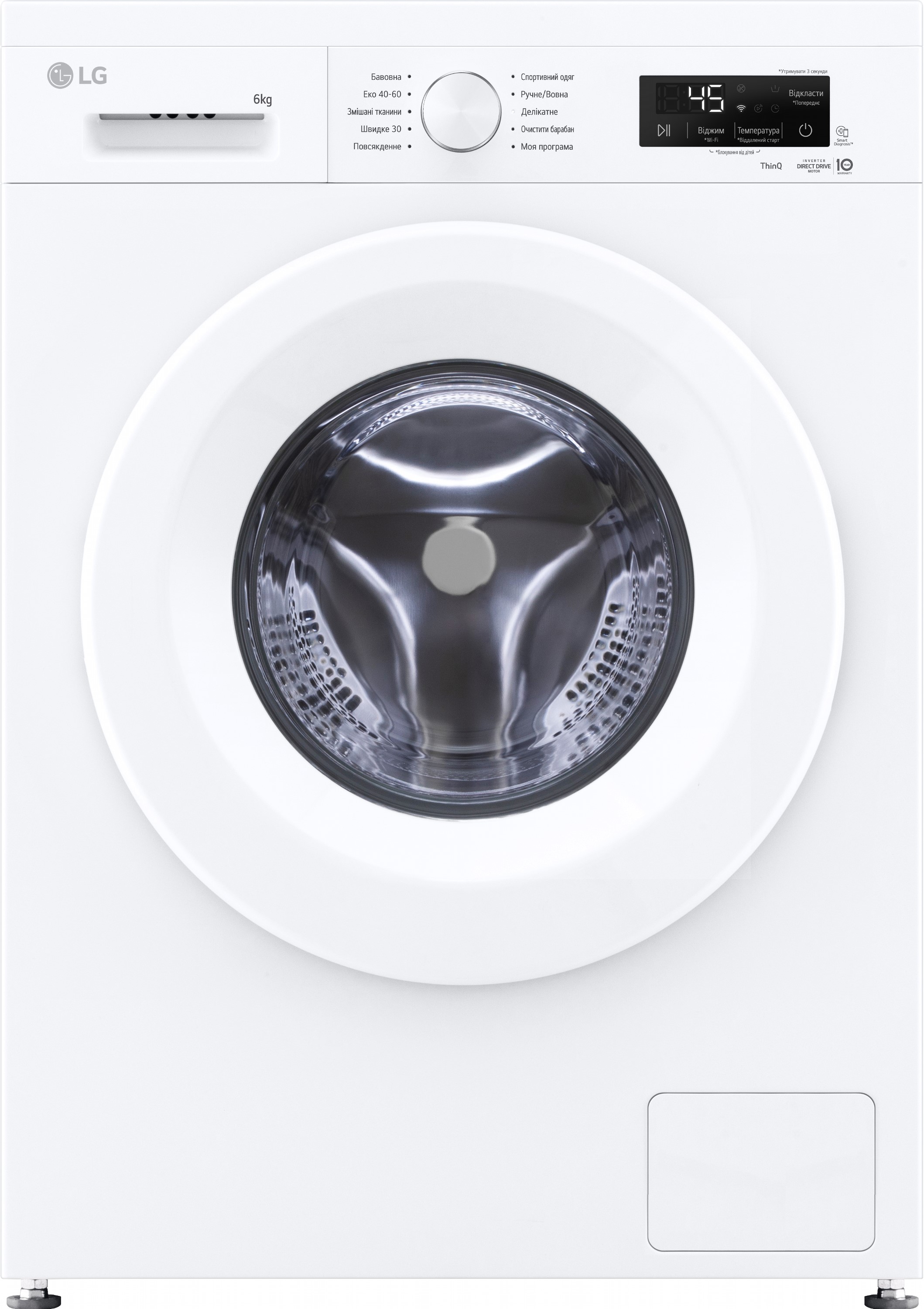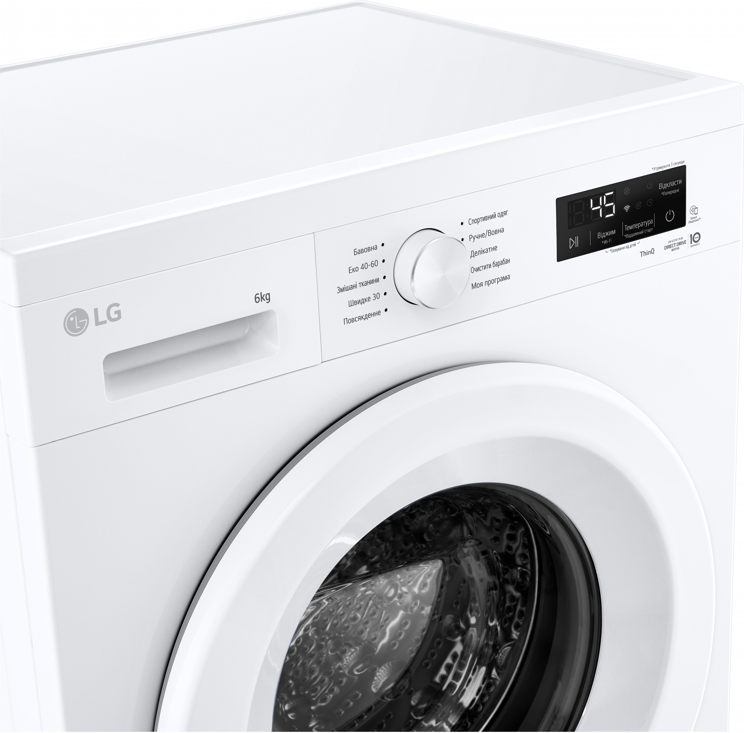 Модель підтримує LG ThinQ (Wi-Fi), що дозволяє керувати пральною машиною дистанційно, контролювати роботу та завантажувати додаткові програми. Для стабільної роботи передбачена технологія контролю напруги (174–400 В) та система контролю піноутворення.