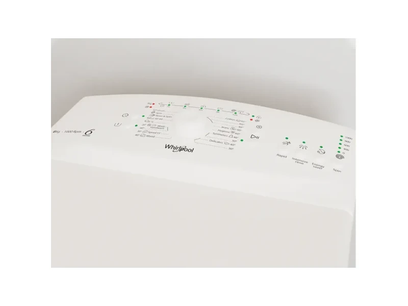 Бренд - Whirlpool; Колір корпусу - Білий; Функції - Відстрочка старту; Тип завантаження - Вертикальна; - Вузькі (сторона 40-49 см); Витрата води за цикл - 43 л; Клас віджиму (залишковий вміст вологи) - C (54-63%); Висота - 86-91 см; см;Максимальне завантаження, кг - 6 кг;Рівень шуму при віджиманні, дБ - 78 дБ;Максимальне завантаження білизни - Від 5 до 6 кг;Тип пральної машини - Автоматичні;Тип двигуна - Колекторний;Глибина - 51-60 см; 90;Кількість програм прання - 14;