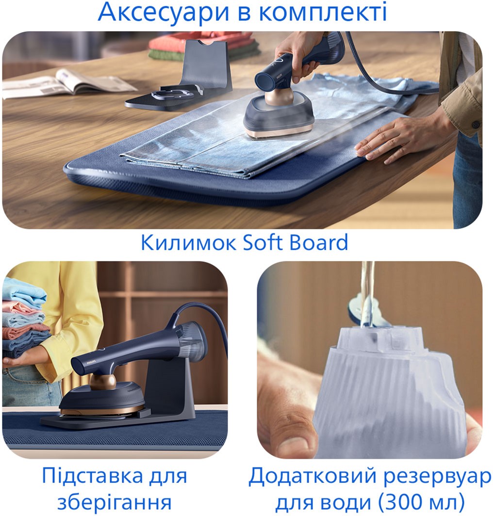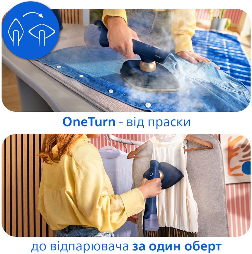 Компактний Philips OneTurn робить догляд за одягом простим — достатньо потужний для повноцінного прасування та готовий за лічені секунди для швидкого усунення складок в останню хвилину. Без додаткових налаштувань і очікування — лише бездоганно випрасуваний одяг без складок тоді, коли це потрібно. Розроблений для швидкості та гнучкості, він постачається зі зручним килимком StyleMat, який дозволяє прасувати або відпарювати будь-де — на столі, ліжку чи стільниці — захищаючи поверхні.